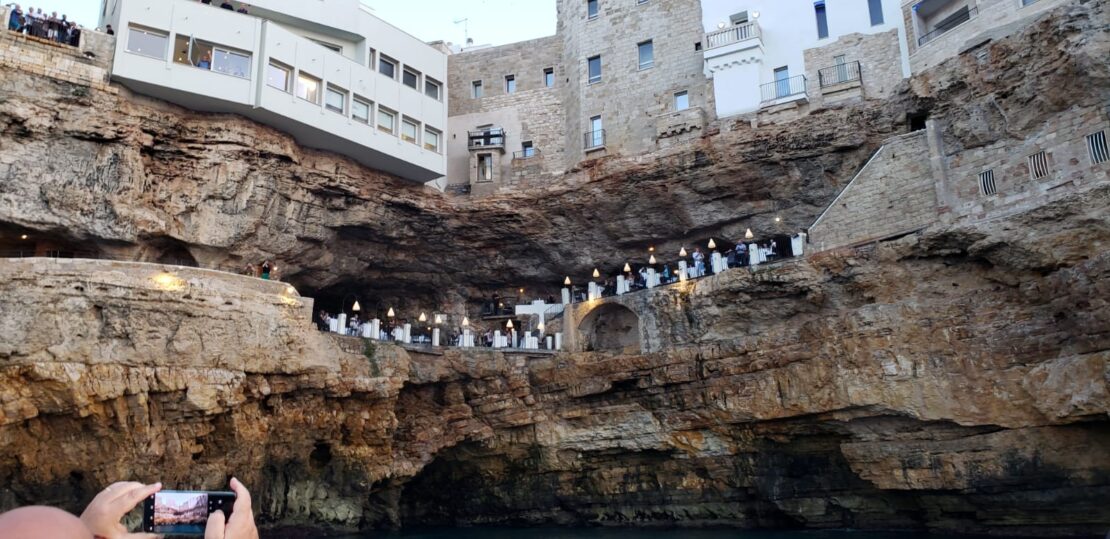Uma das cenas do vídeo onde apresento Polignano é no espaço do Dino, o proprietário do Aquamarea, apresentado pela minha amiga Sabrina Merolla. É um mix de restaurante, bar e opções de hospedagem de quartos, em uma construção original maravilhosa na rocha, com uma vista inacreditável para o mar e a Lama Monachile.