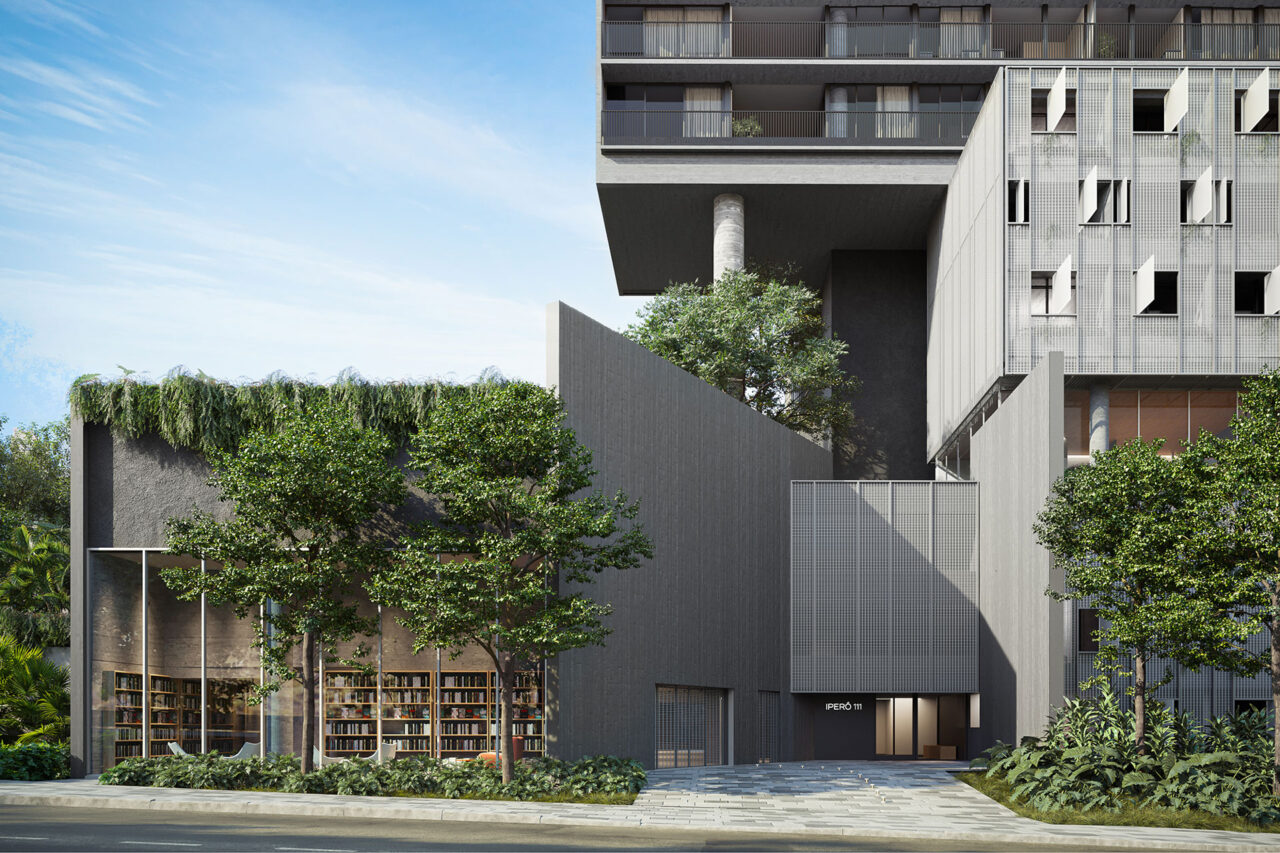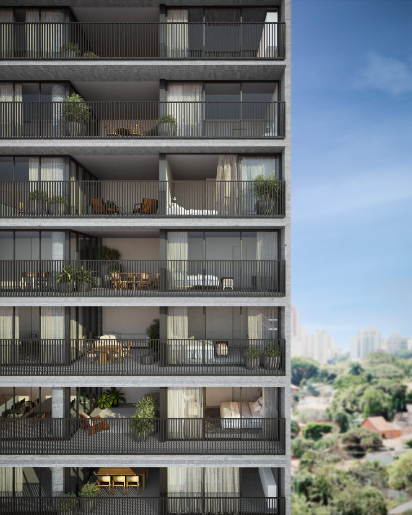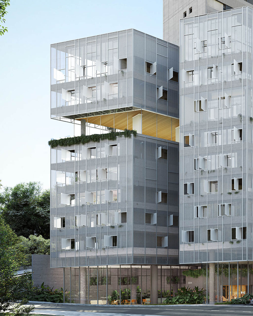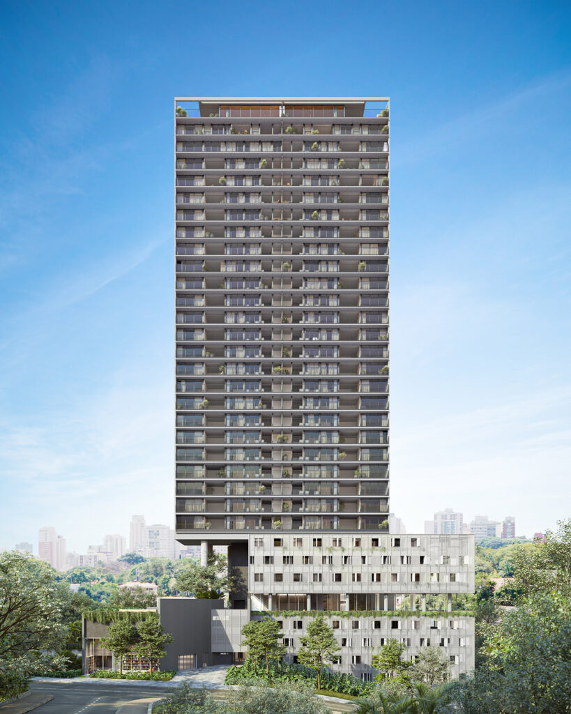 A implantação proposta por Gui Mattos tira proveito do relevo do terreno colocando estúdios, escritórios e uma galeria comercial no embasamento e dessa forma o primeiro apartamento está 7 andares acima do nível da rua, já com a melhor vista da zona oeste.