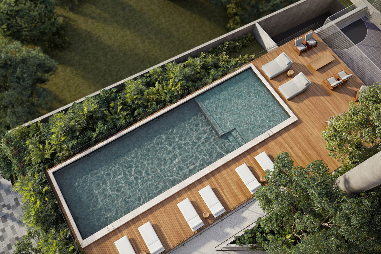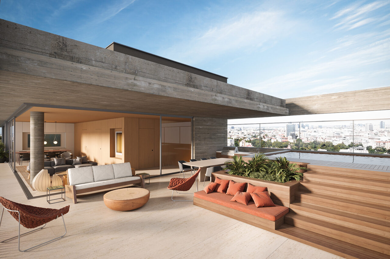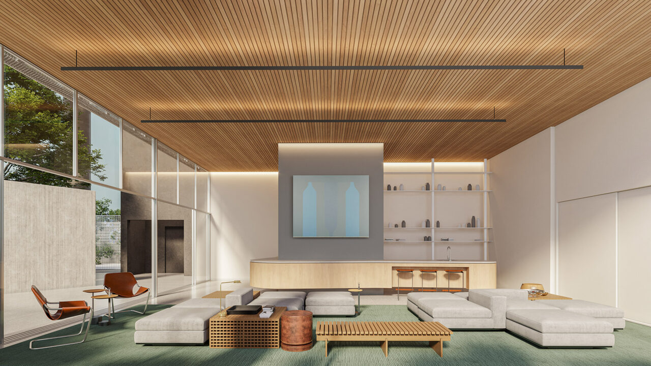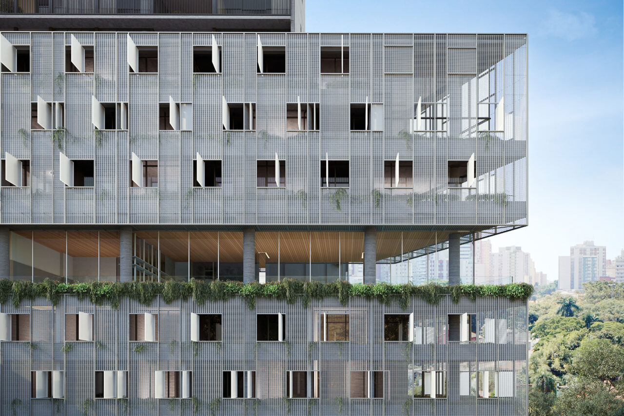 A implantação proposta por Gui Mattos tira proveito do relevo do terreno colocando estúdios, escritórios e uma galeria comercial no embasamento e dessa forma o primeiro apartamento está 7 andares acima do nível da rua, já com a melhor vista da zona oeste.