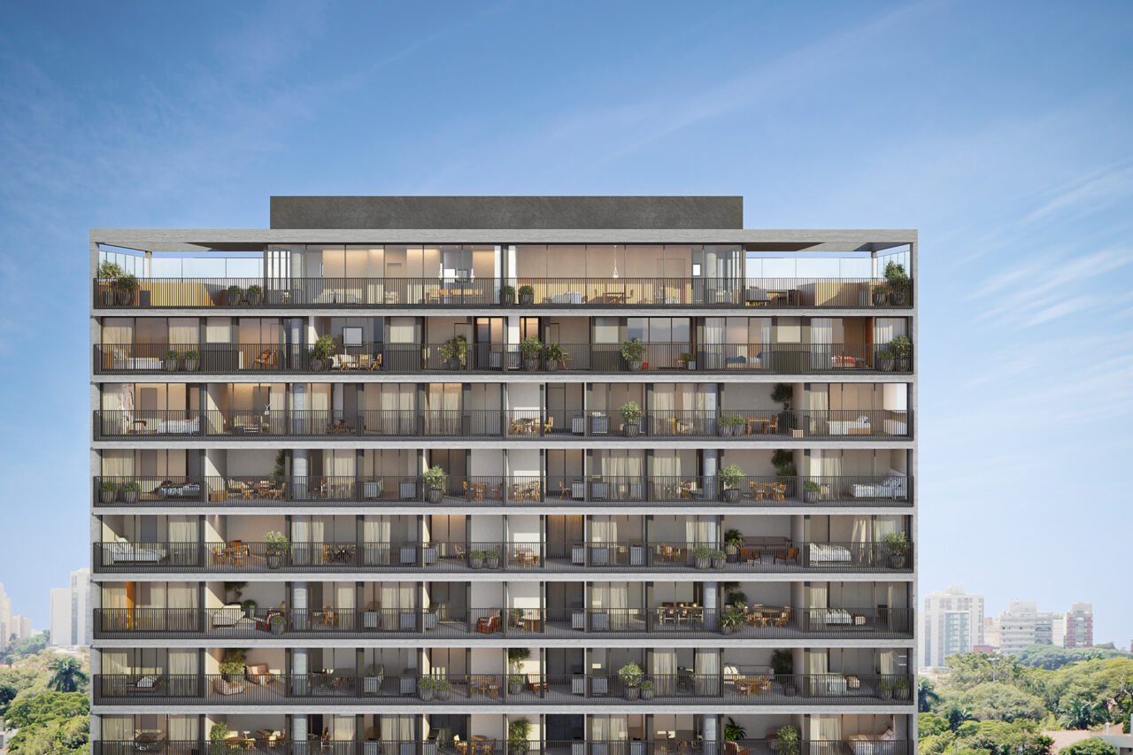 O IPERÓ111 fica na parte alta da Vila Madalena e no limite entre áreas com zoneamento diferente. Atrás estão os edifícios de gabarito mais alto, enquanto à frente todos os apartamentos têm vista perene desobstruída desde o primeiro andar.