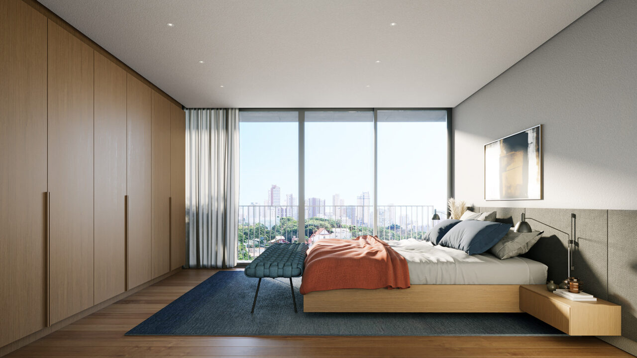 O arquiteto priorizou a vista como premissa de projeto. Com o edifício em formato de lâmina, os apartamentos têm, na face voltada para a vista, caixilhos em toda extensão. O formato esguio com apenas dois apartamentos por andar alinhados um com o outro viabiliza o frescor da ventilação cruzada em todas as suas 46 unidades.