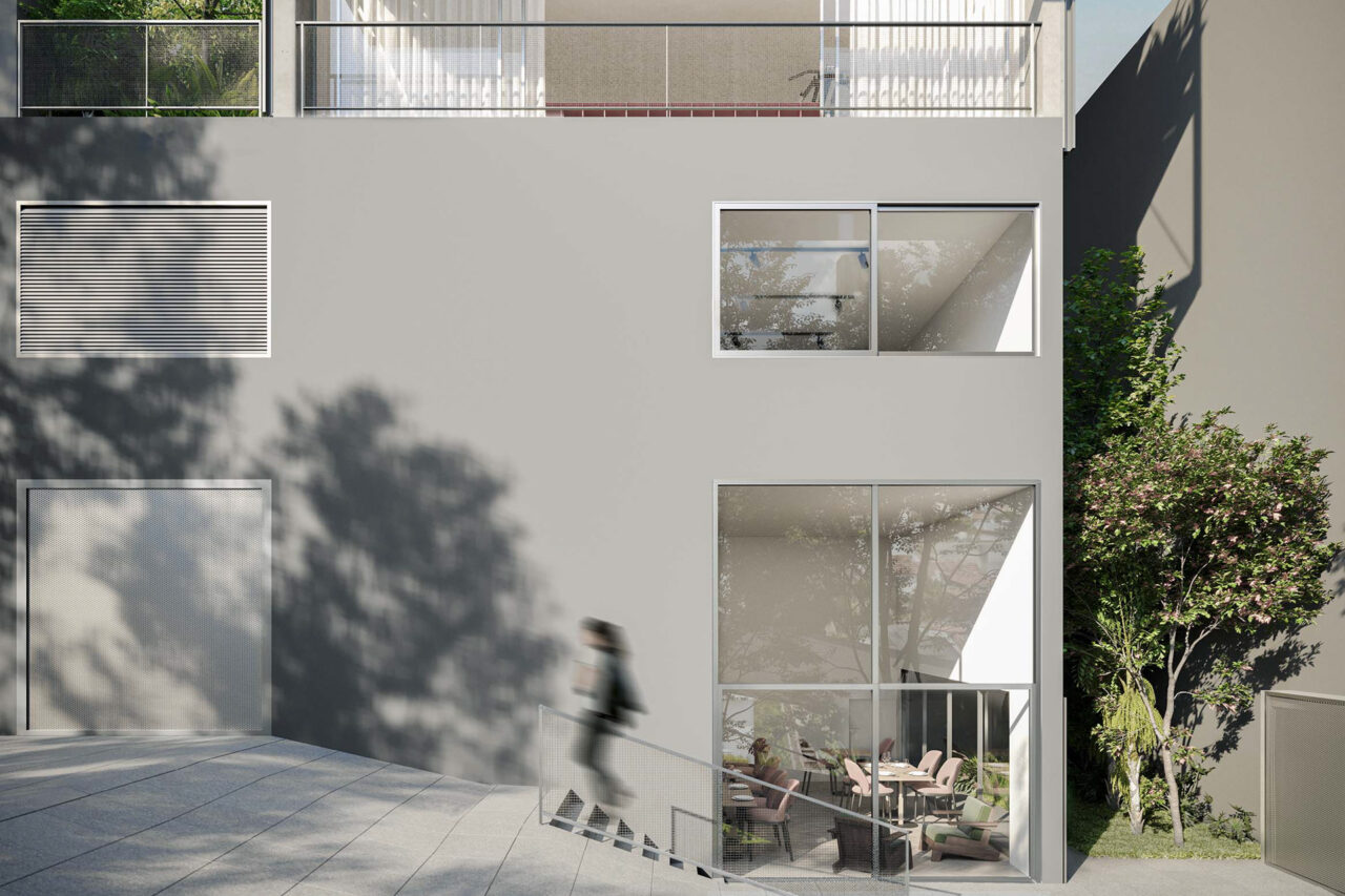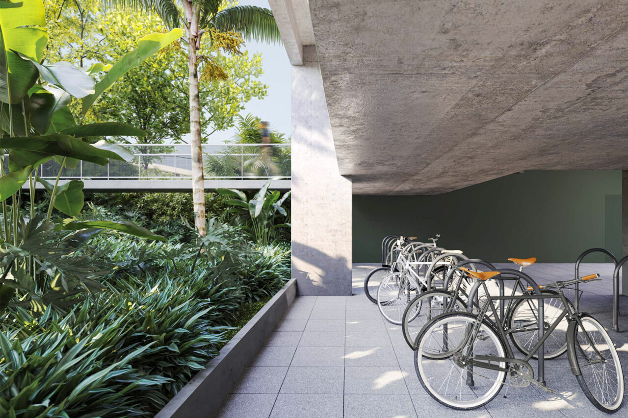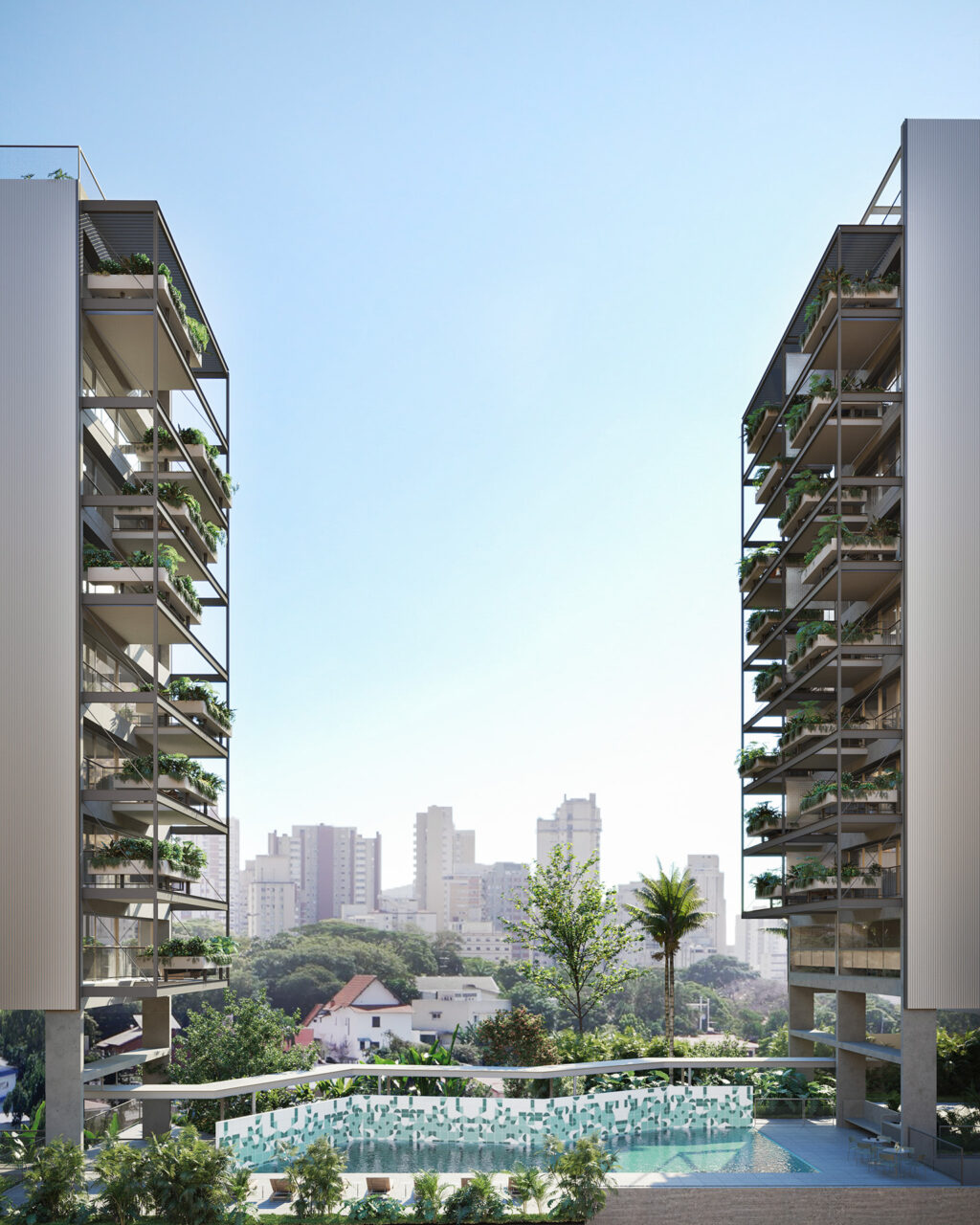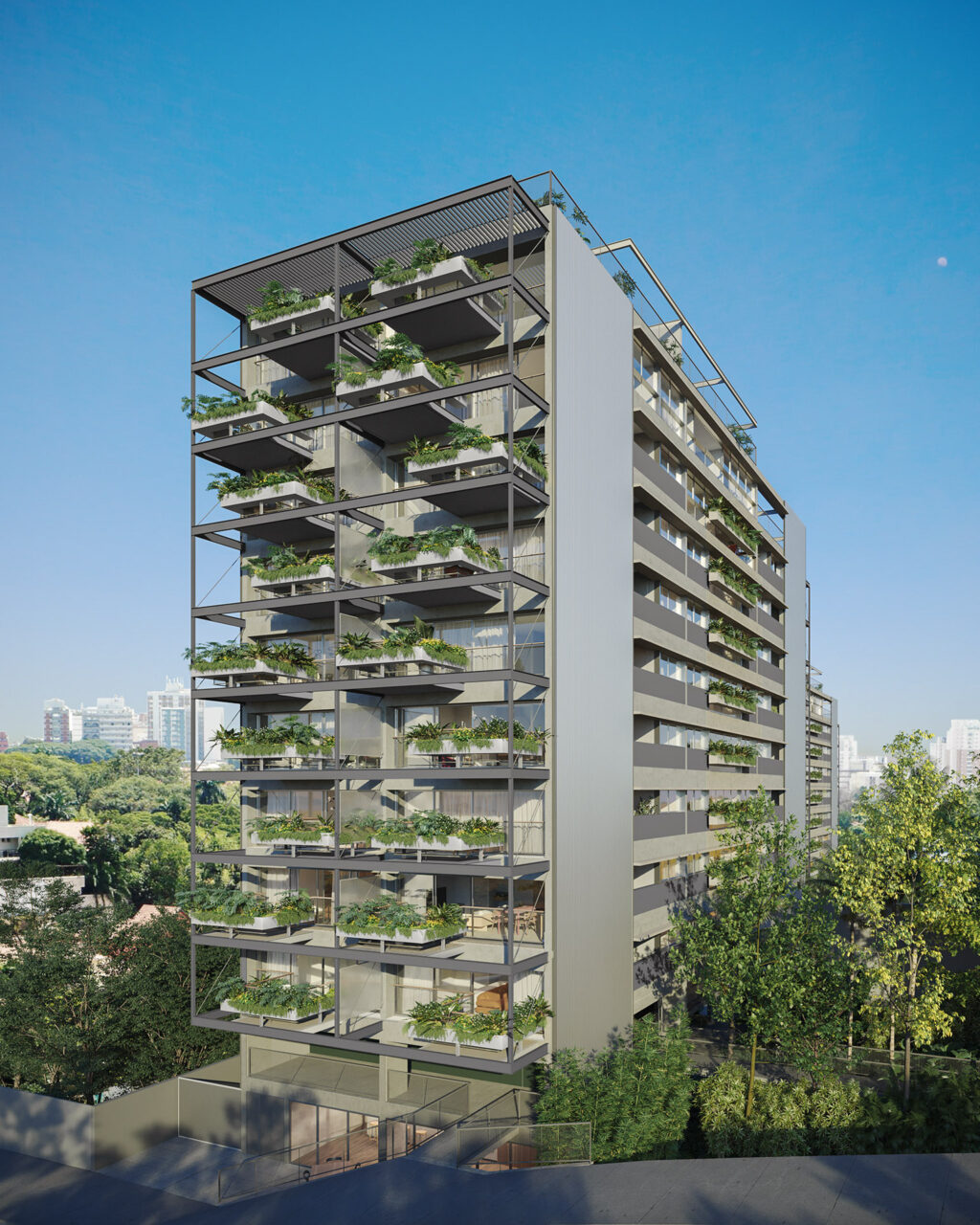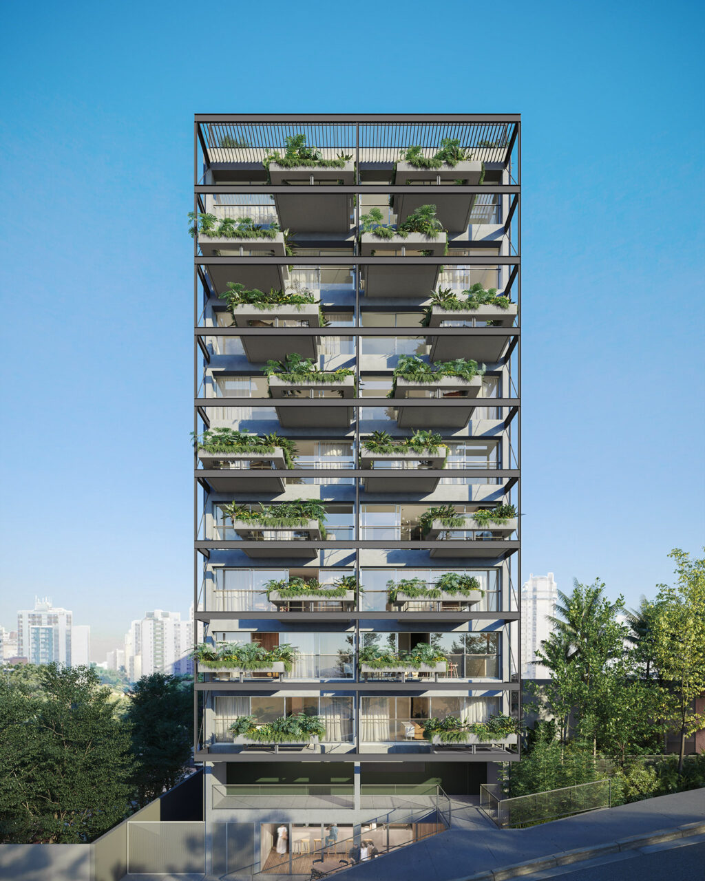 A fachada é composta por uma esguia estrutura metálica aparente que sustenta varandas intercaladas com momentos de pé direito duplo. Isso permite visuais ampliadas de céu para cada andar. Janelões em todos os cômodos proporcionam entrada abundante de luz natural, sem deixar de lado a privacidade que é garantida pelas jardineiras com irrigação automática.