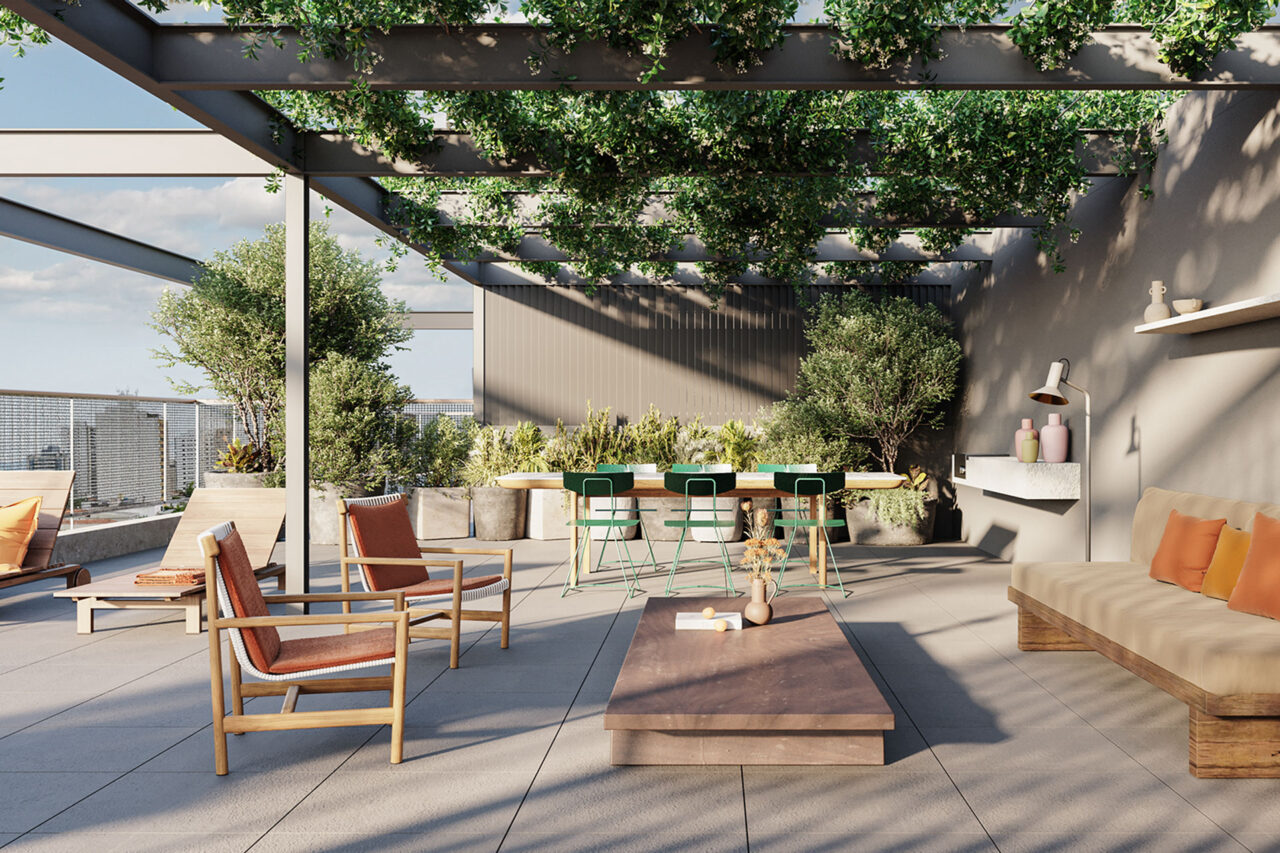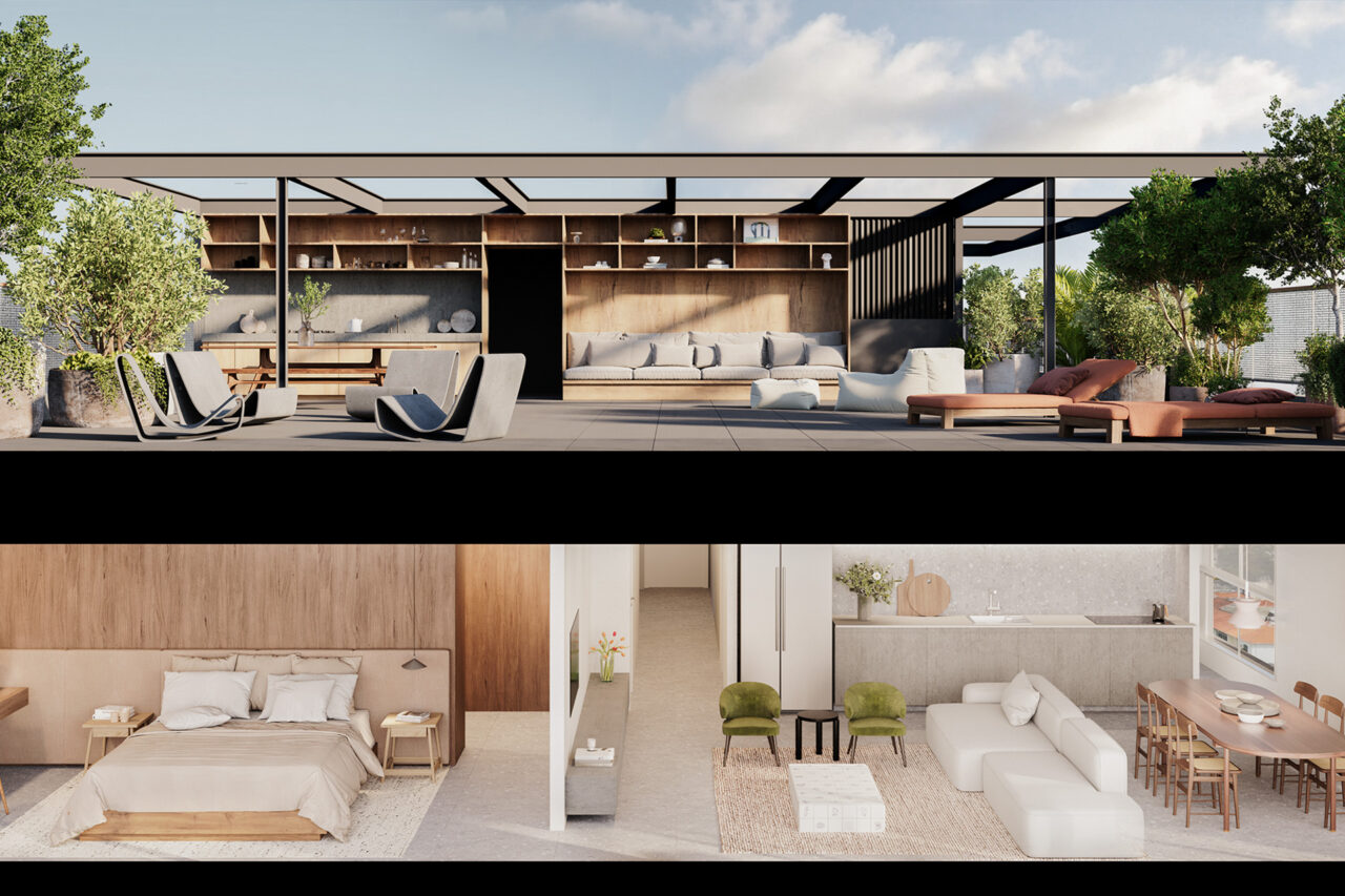 As varandas, aliás, são um dos destaques do projeto. Sustentadas por elegantes estruturas metálicas, sua disposição alternada cria uma dinâmica interessante para a fachada. Jardineiras com irrigação automática completam o conjunto com uma proteção verde.