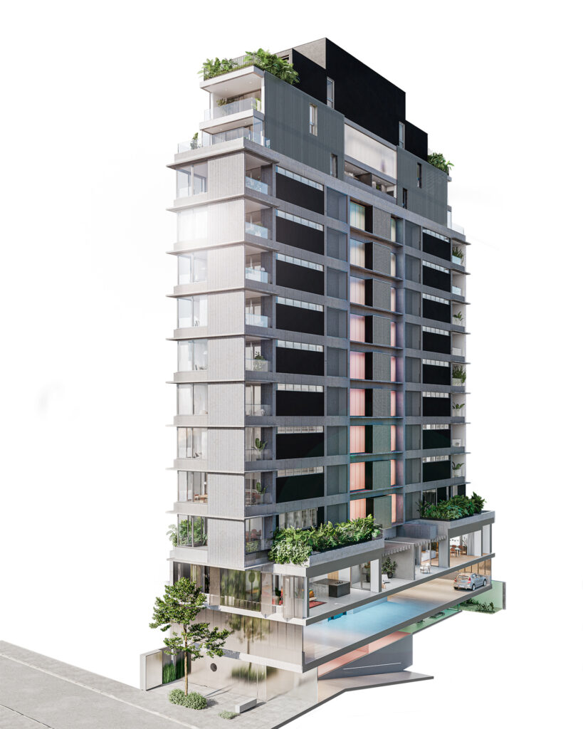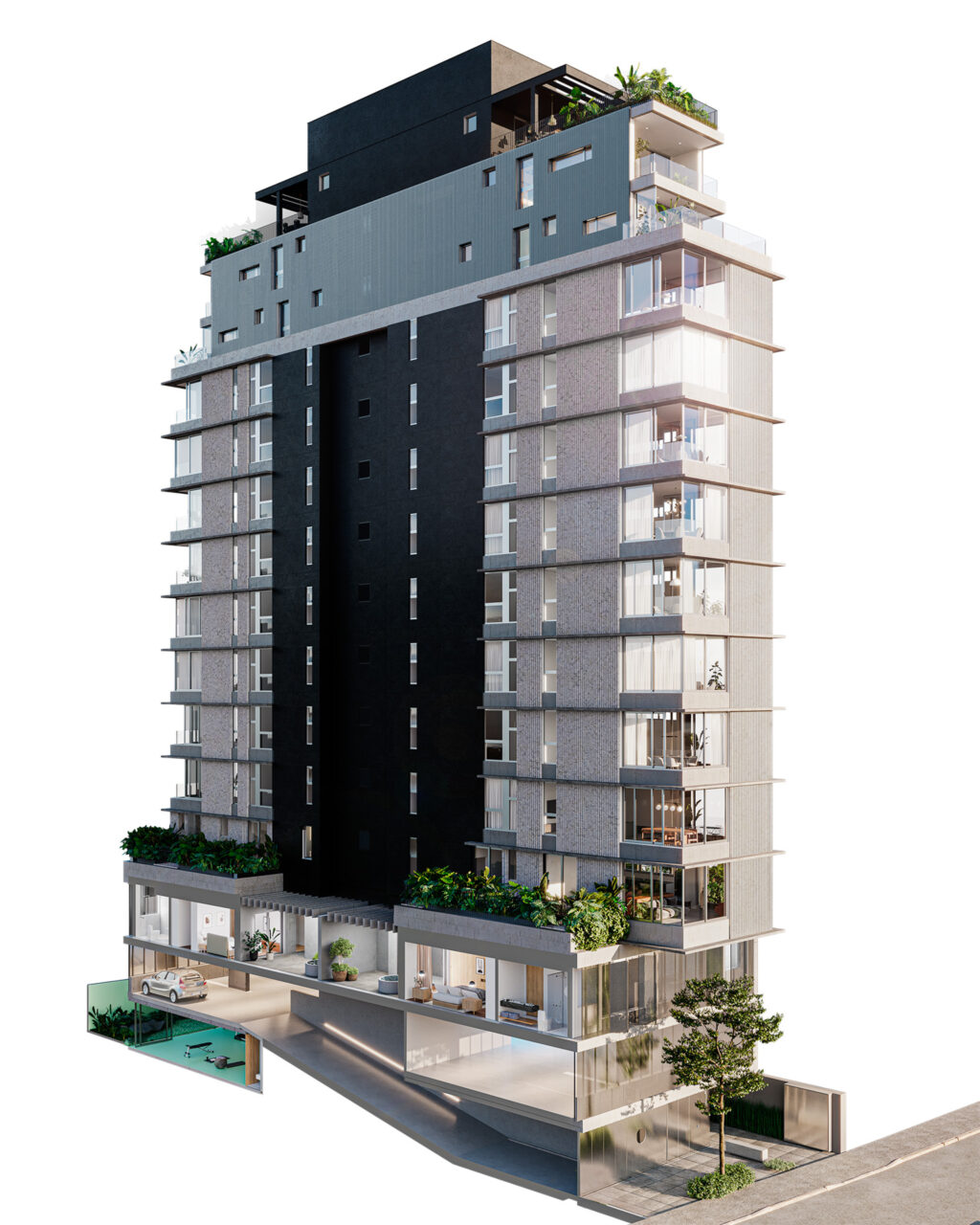 Com projeto de AR Arquitetos, um dos escritórios mais promissores no cenário atual, o edifício traz uma estética elegante e atemporal para a paisagem do bairro.