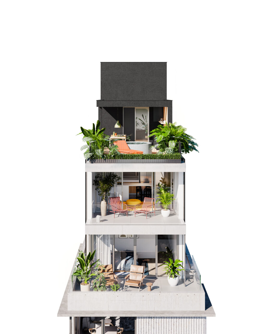 Os painéis em concreto-polímero elevam a materialidade e verticalidade, enquanto o térreo revestido de chapas de alumínio reflete a rua e o estilo de vida contemporâneo do bairro.