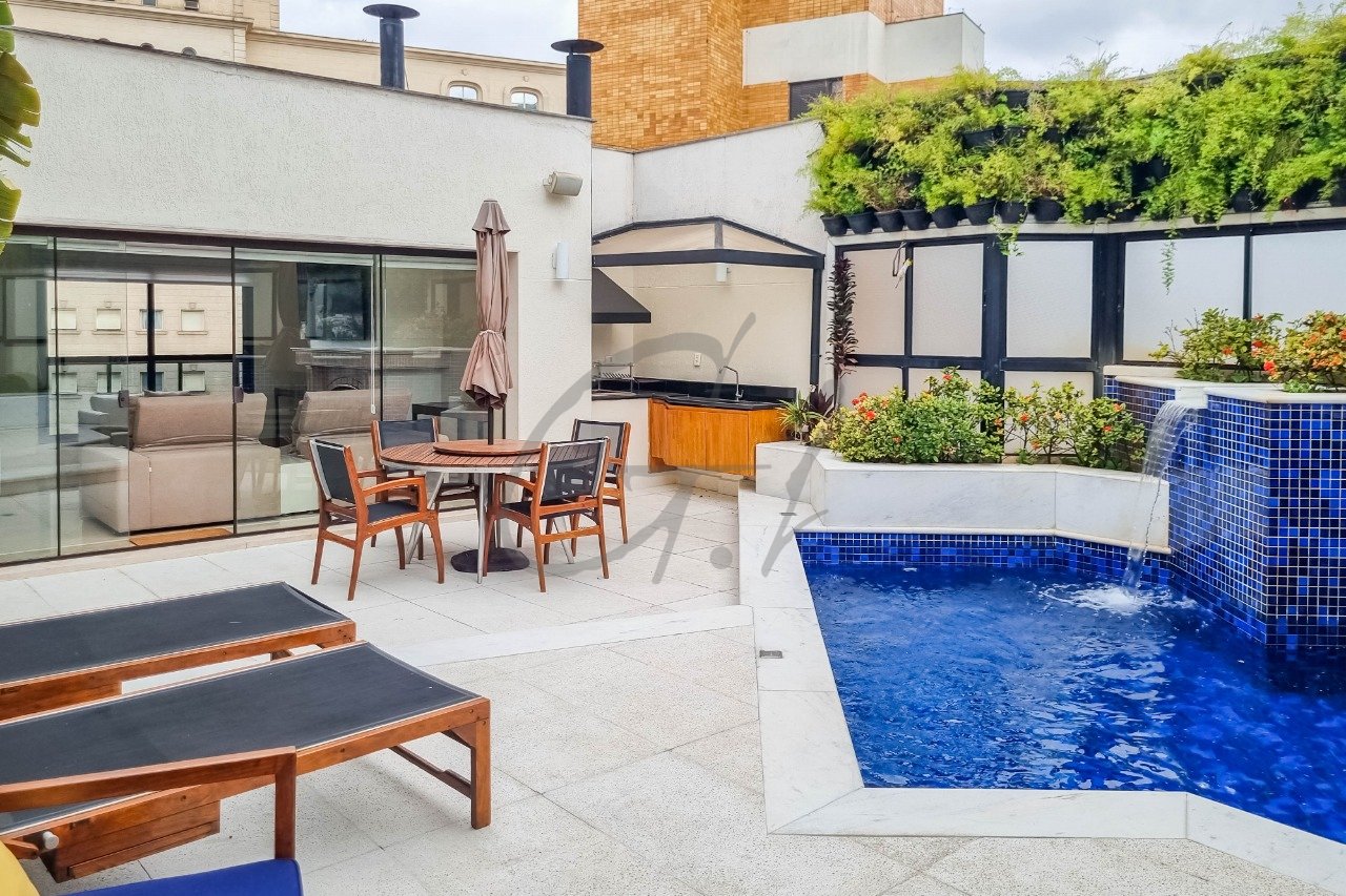 Cobertura duplex mobiliada, com amplas varandas em vários ambientes. No piso superior área social com hall de entrada, sala de estar com lareira , sala de jantar, lavabo e agradável área externa com piscina de cascata, churrasqueira e sauna. Copa com adega, cozinha grande com 2 despensas.