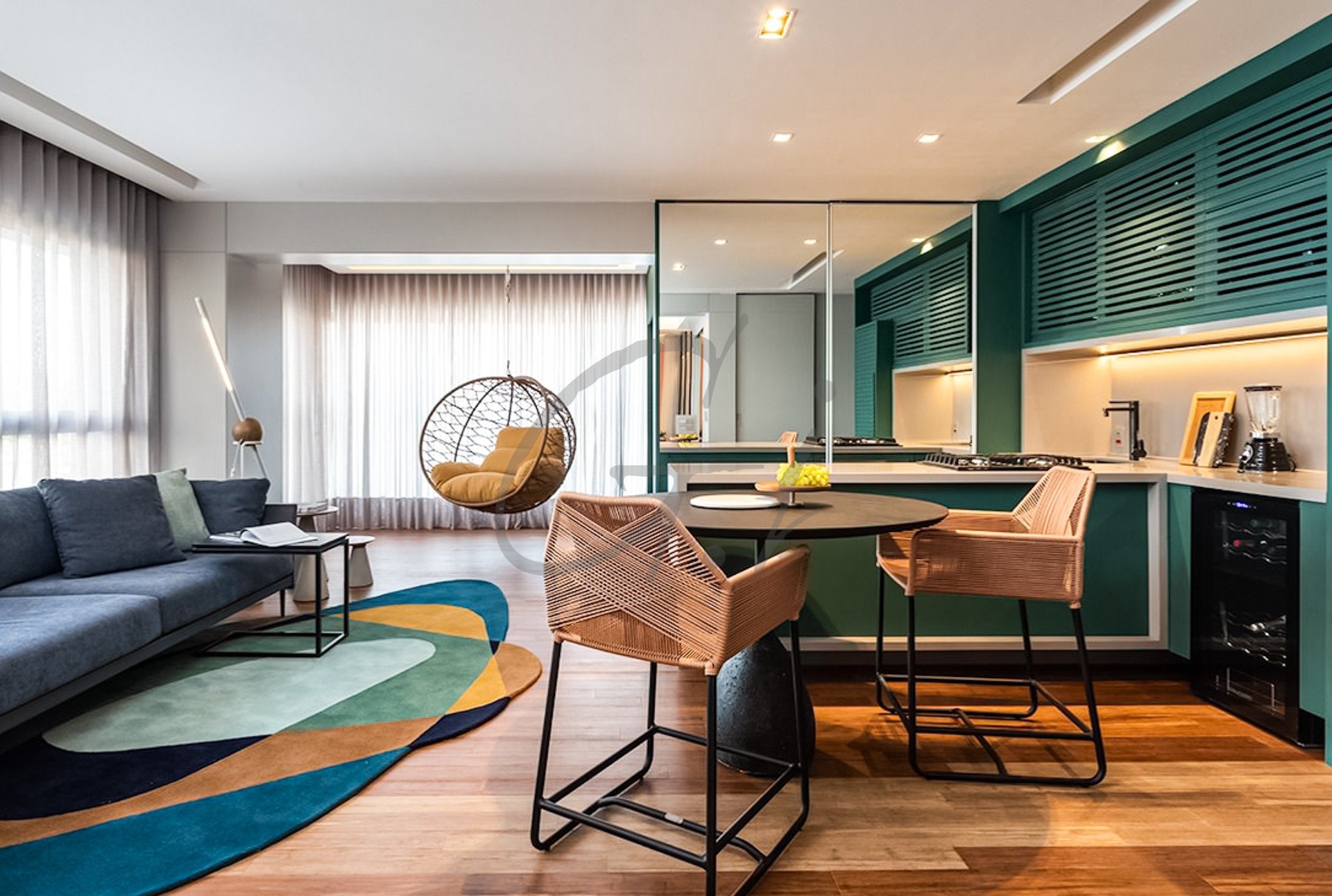 Apartamento com piso em madeira, laka verde e armários de vidro.