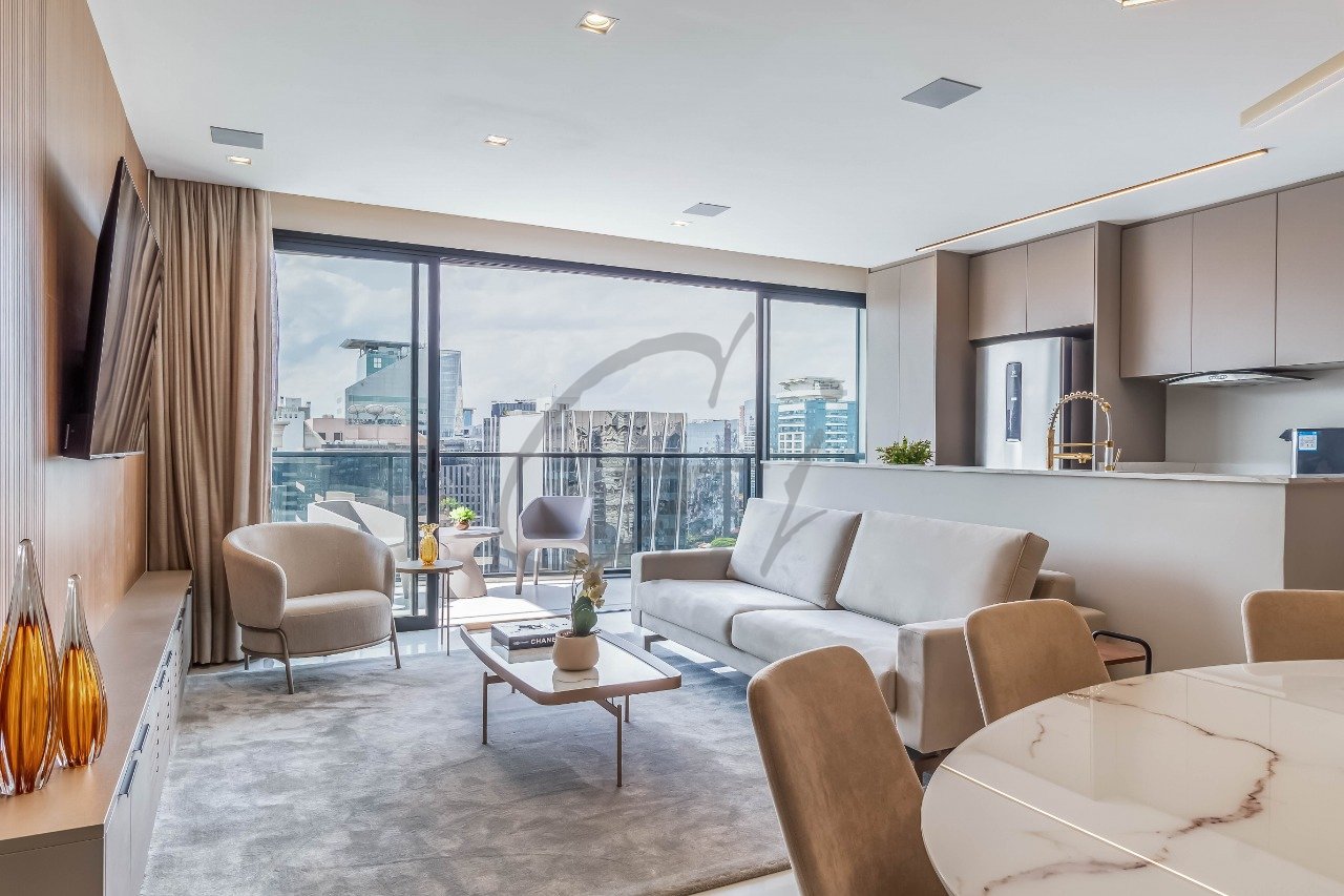 Área social com sala de estar, jantar e varanda com vista deslumbrante.