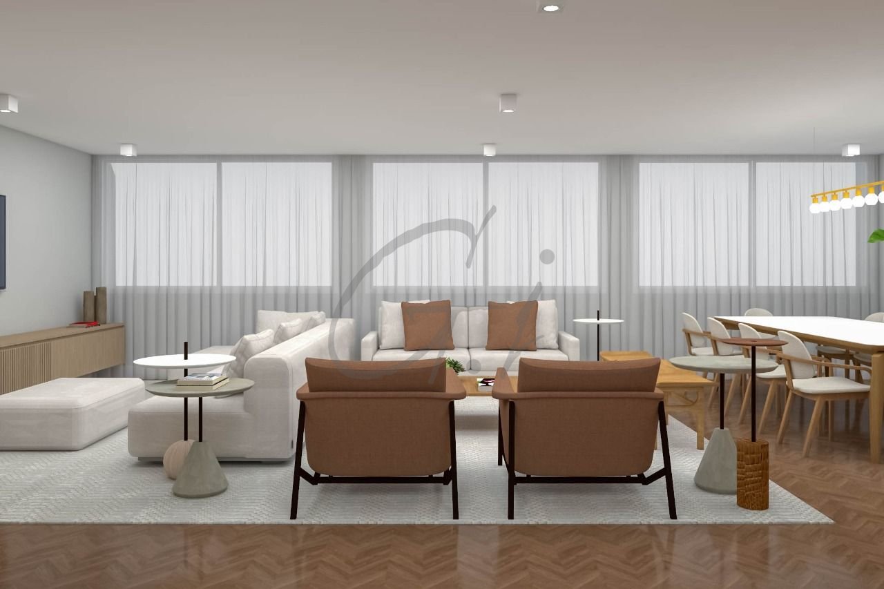 Área social com sala de estar, jantar e janelões.