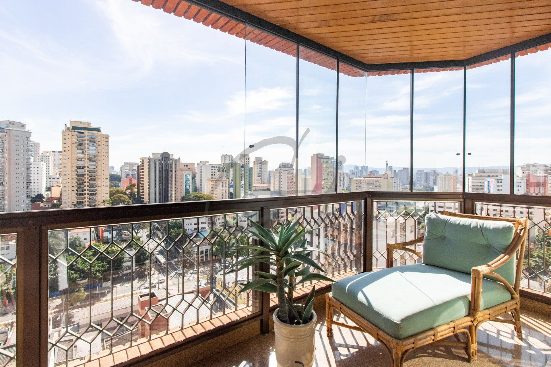 Área social com piso em madeira de tábua corrida e três ambientes integrados a espaçosa varanda com vista aberta.