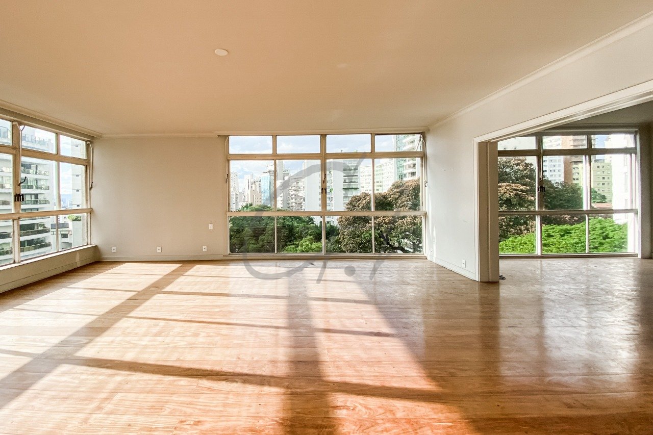 Área social com dois espaçosos ambientes, janela piso-teto de ponta a ponta e piso em madeira de tábua corrida.