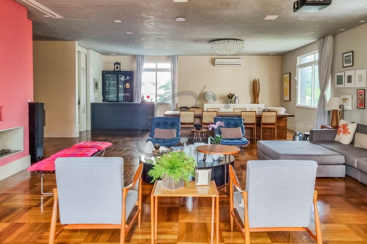 Área social muito ampla com vários ambientes como hall de entrada, lavabo, sala de estar com lareira, sala de jantar e sala de tv, todos iluminados por janelões com vista para as árvores.