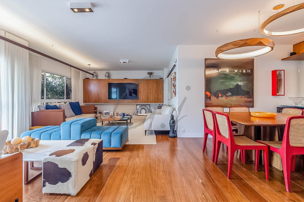 Área social espaçosa com sala de estar, jantar, varanda e uma lareira. Sala de TV, envolvida por um painel de madeira.