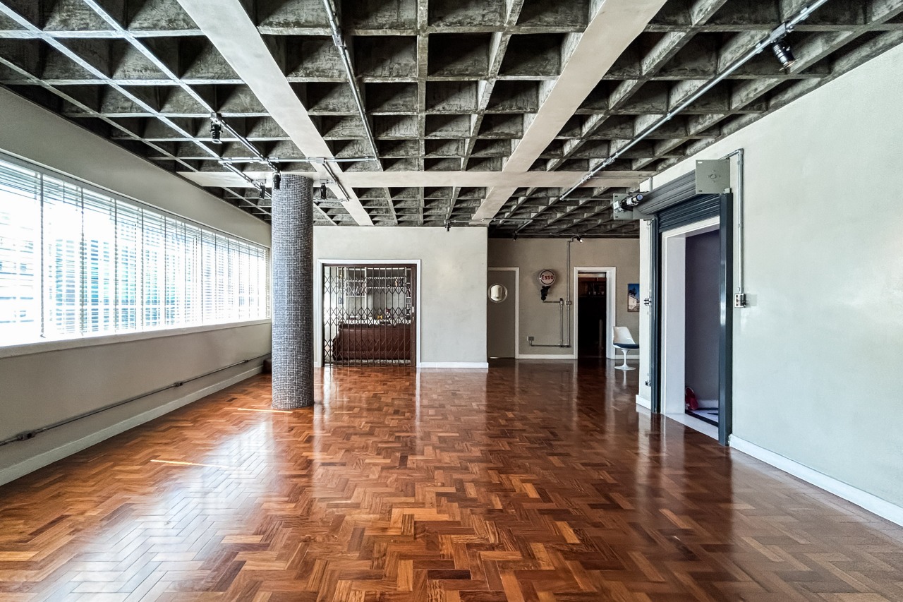 Áreas íntima e social com piso original em taco de madeira em ipê rosa e suíte com piso de madeira de demolição.
