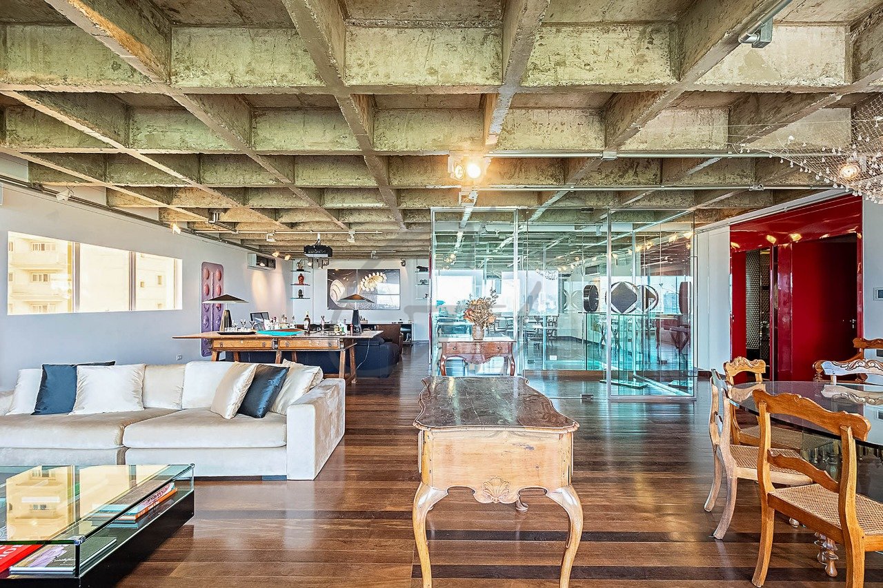 Teto de concreto em colmeia e piso todo em madeira sucupira paginado.