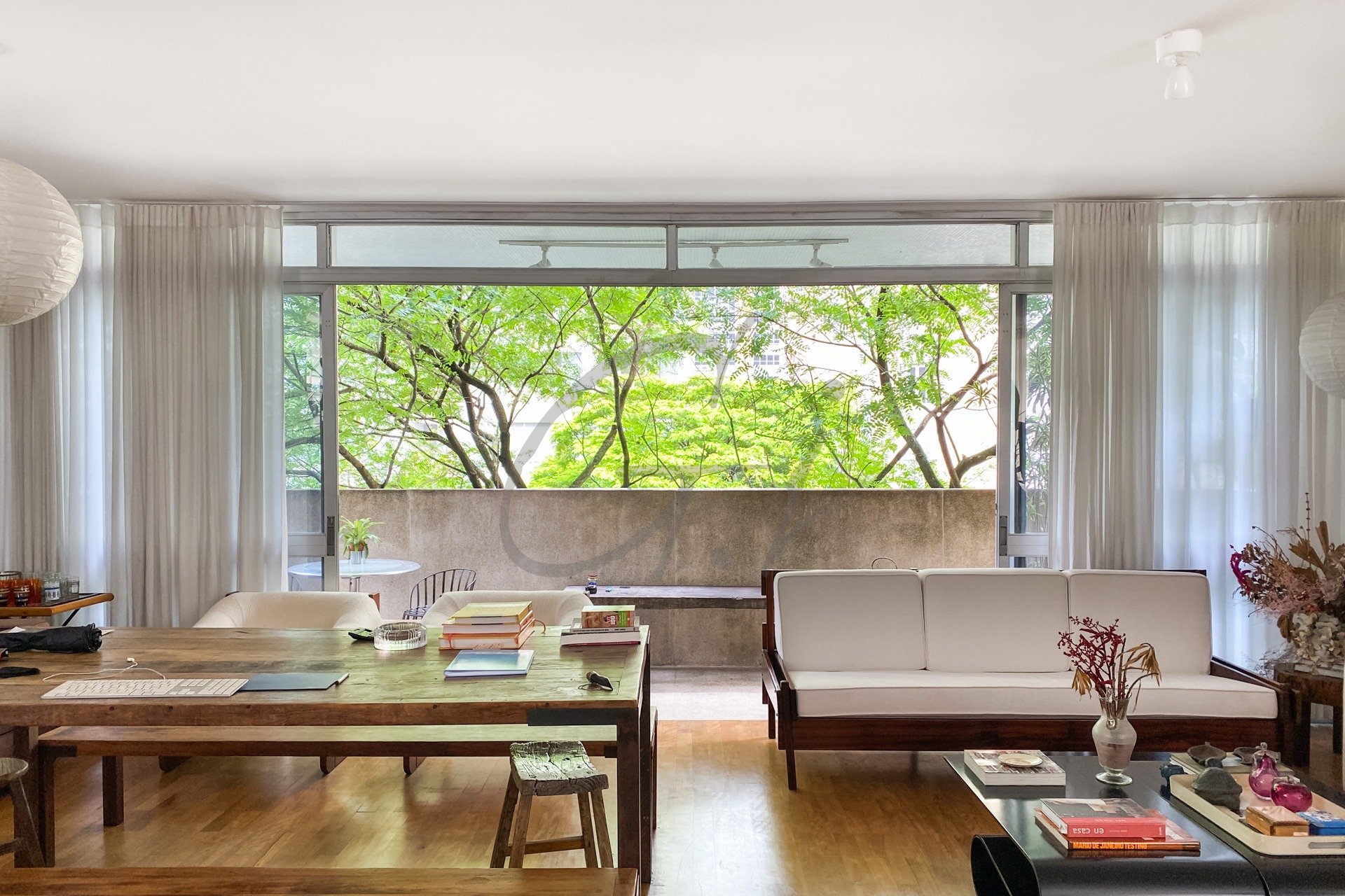 Apartamento totalmente integrado com janelões e vista para a copa das árvores.