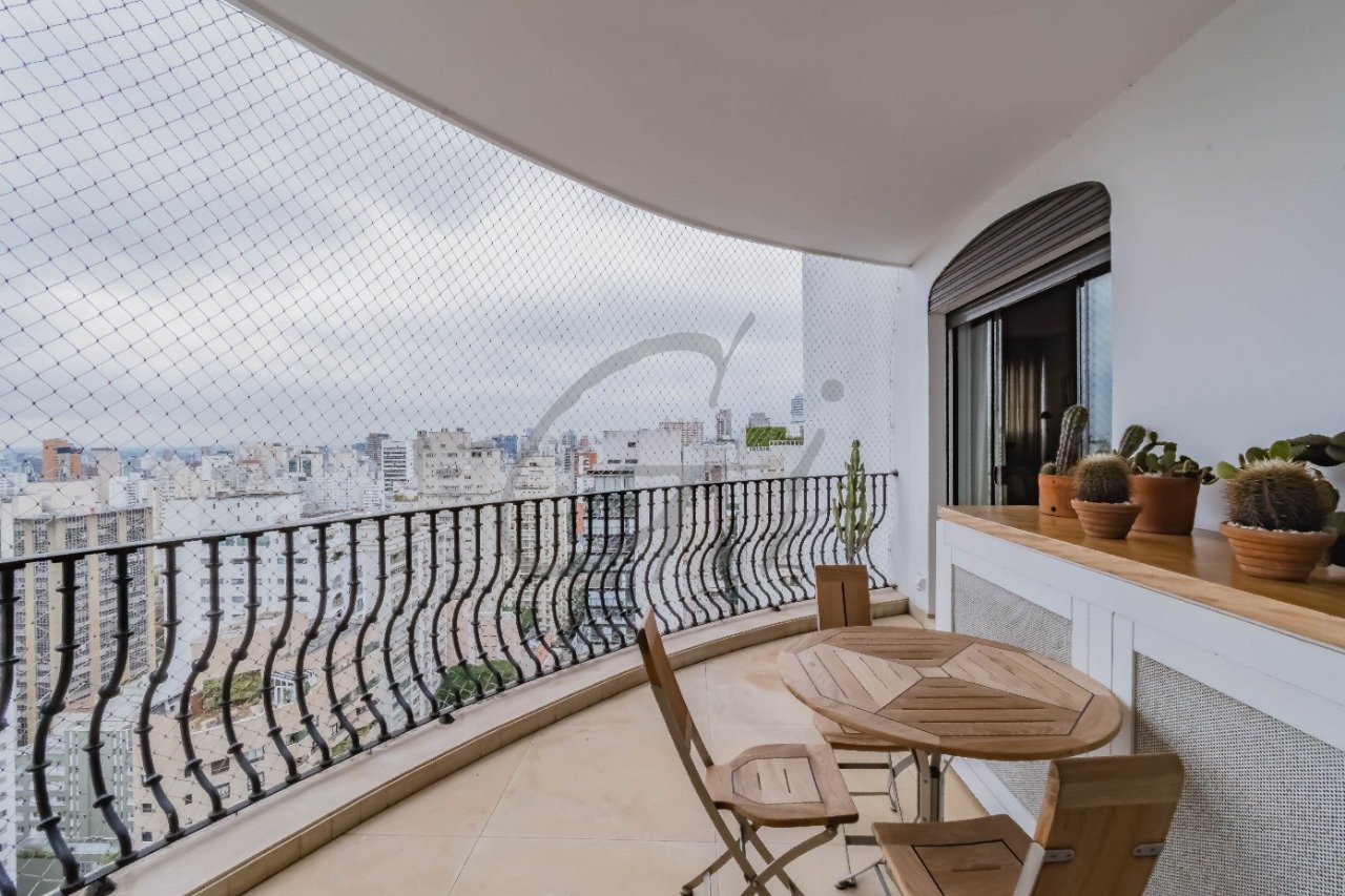 Área social com sala de estar, jantar, sala de TV e varanda arredondada.