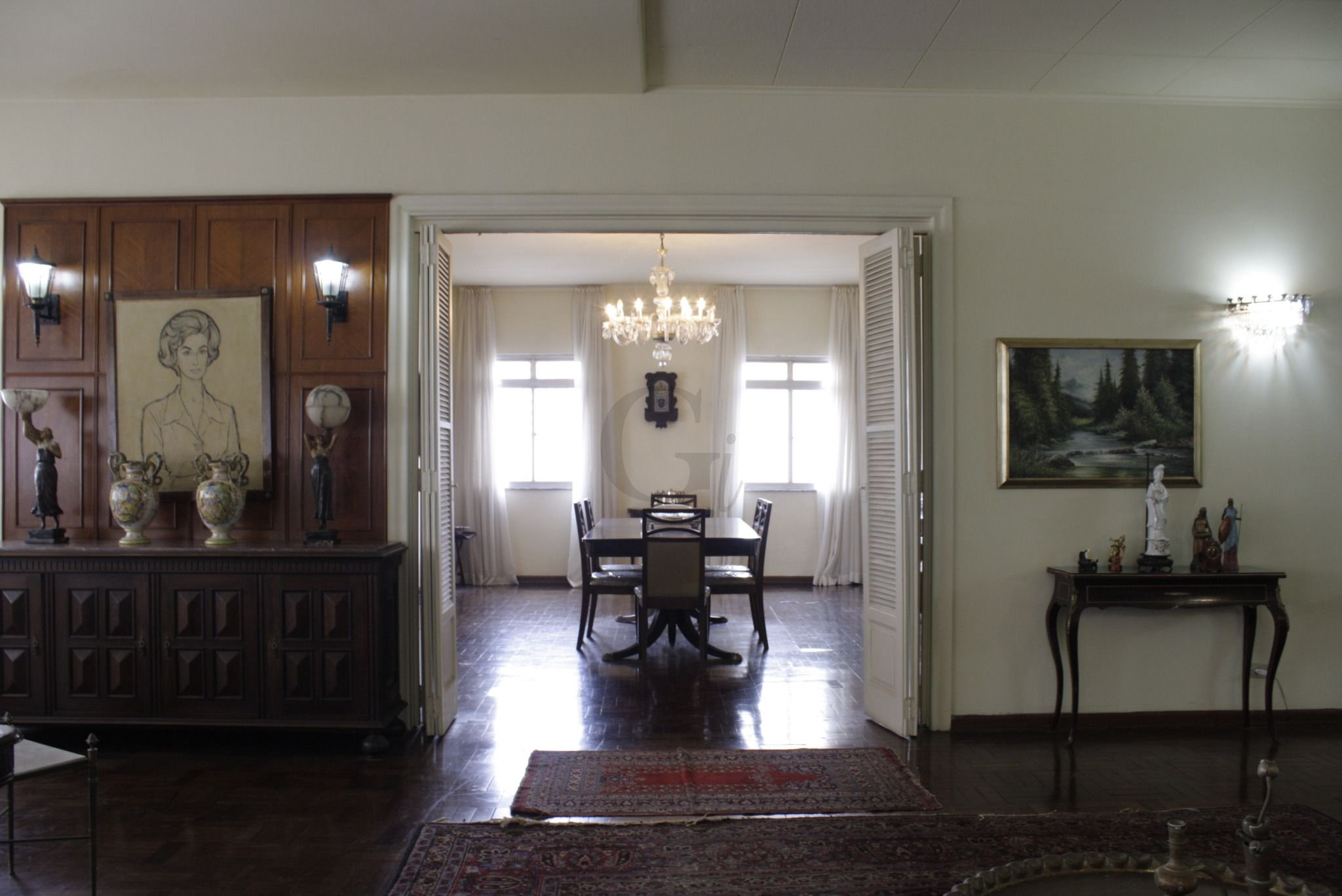 Do enorme hall do elevador vê-se uma porta dupla que leva à esse incrível apartamento em estado original dos anos 60. Hall de entrada com lavabo, antecede a imensa sala de estar integrada à sala íntima, sala de jantar, e biblioteca.