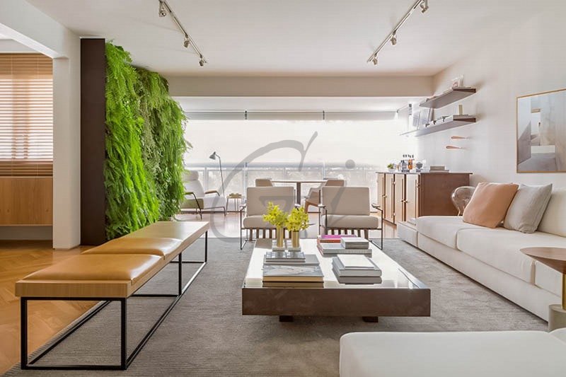 Área social com escolha de tons neutros e madeira. A integração da varanda aos demais espaços aumentou ainda mais o living e o jardim vertical leva vida ao interior.