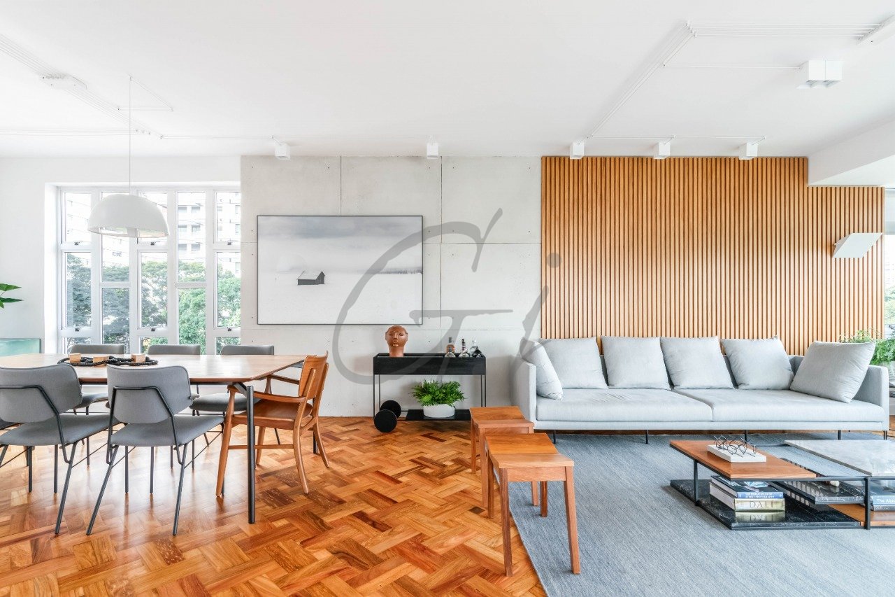 Área social com vista permanente para a copa das árvores e jardins. Piso em taco por todo apartamento.