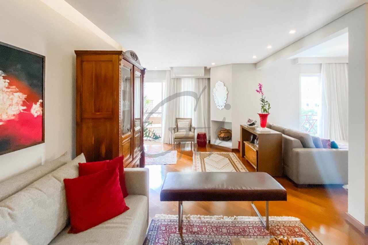 Área social com piso em tábuas de madeira, sala de estar, jantar e varanda.