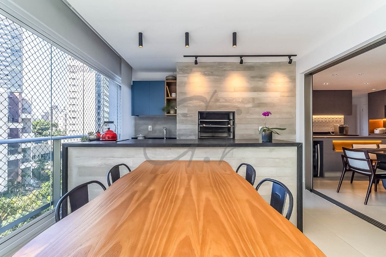 Varanda gourmet com um toque contemporâneo, se torna uma extensão da área social, proporcionando um ambiente descontraído e elegante.