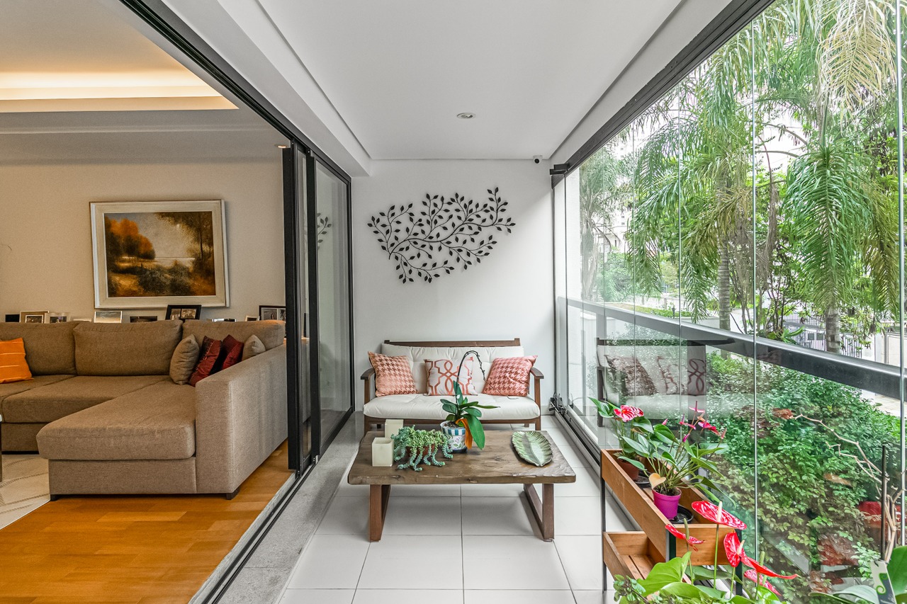 Área social com sala de estar, jantar, tons neutros e varanda fechada com vidro e vista para a copa das árvores.