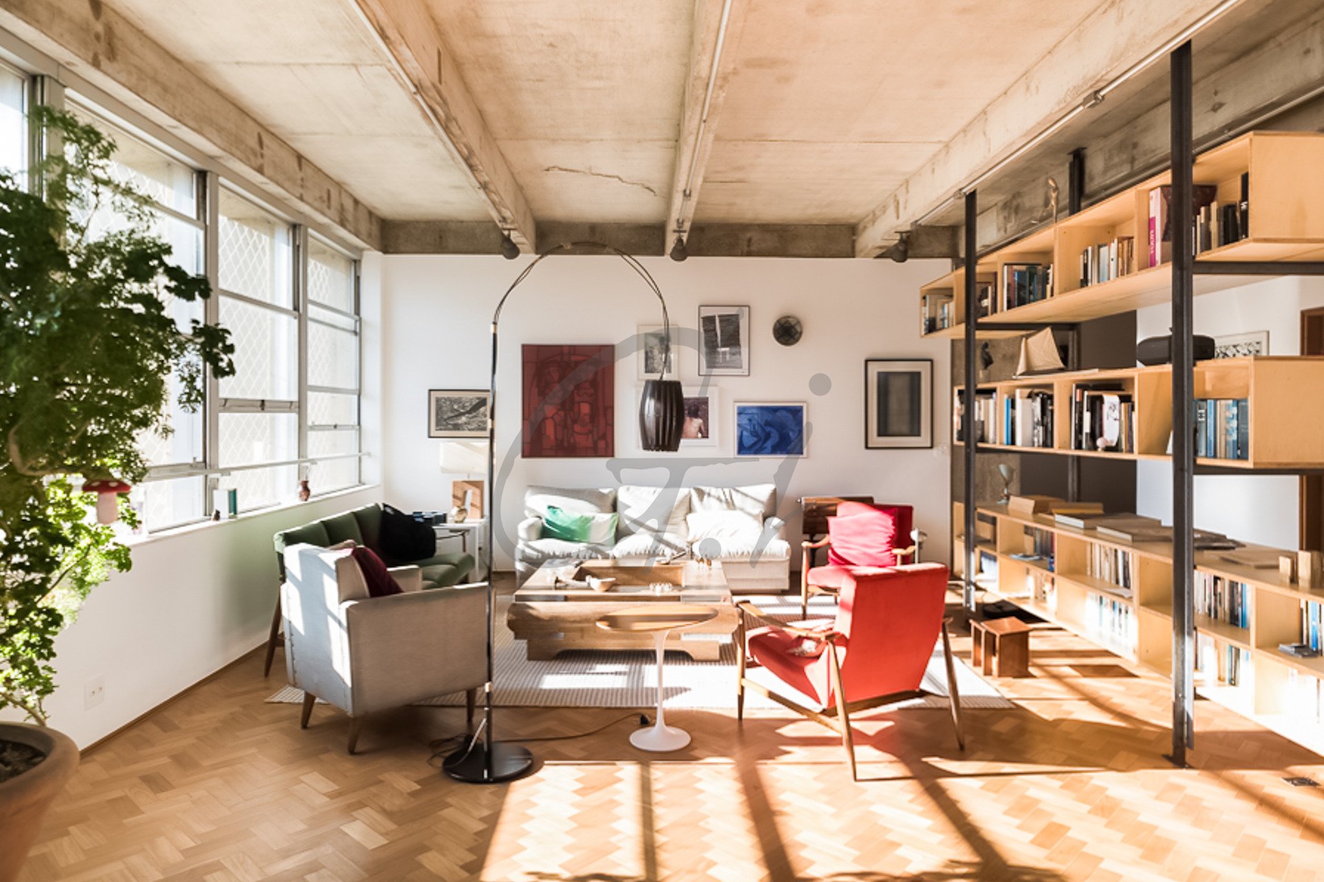 Apartamento reformado com viés brutalista, amplos ambientes integrados e quase 360 graus de janelões.