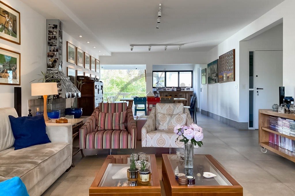 Área social com ampla sala para vários ambientes, lareira e varanda integrada com vista para o verde.