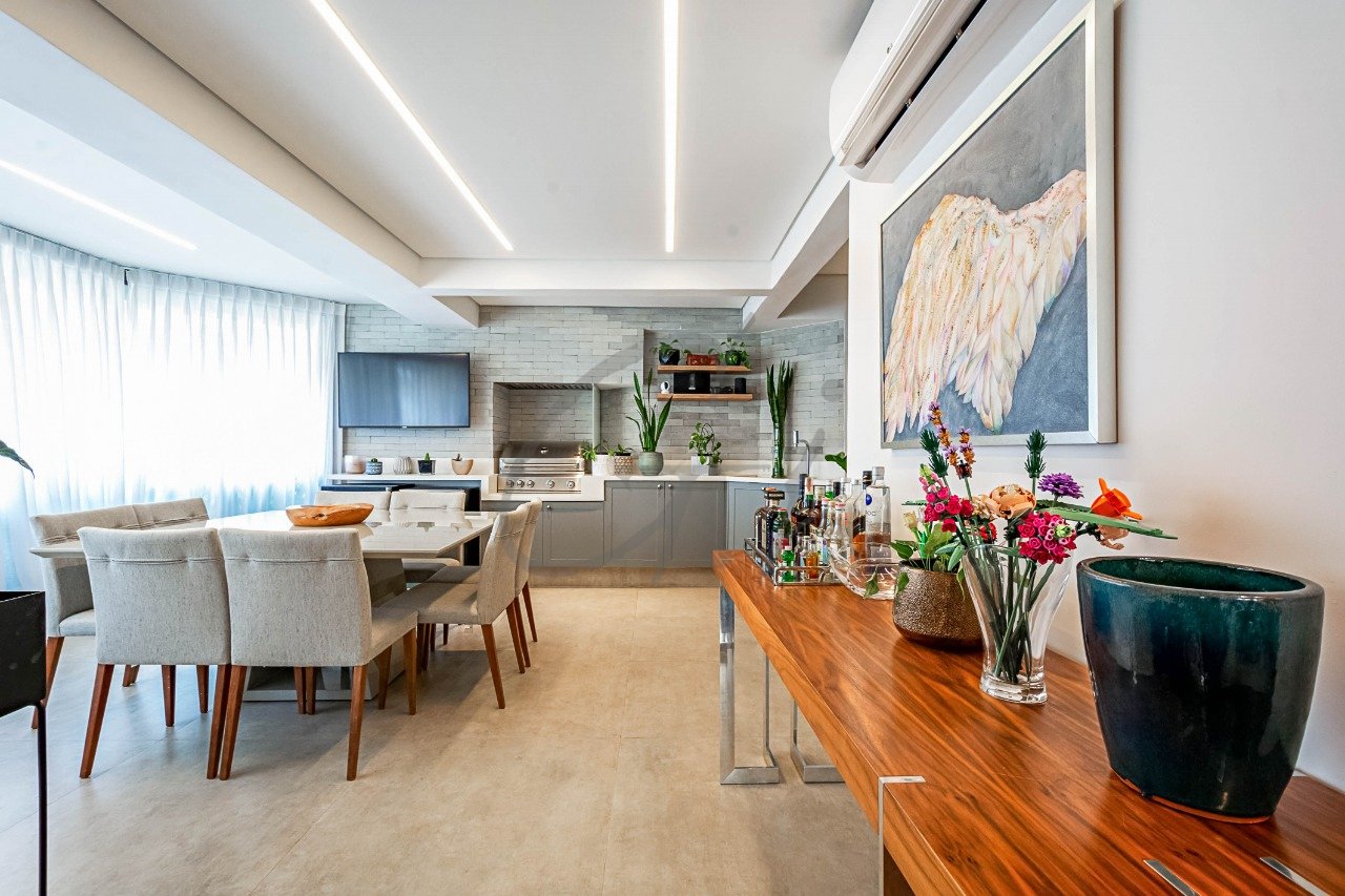 A sala de jantar ganhou mais espaço com a integração do gourmet.