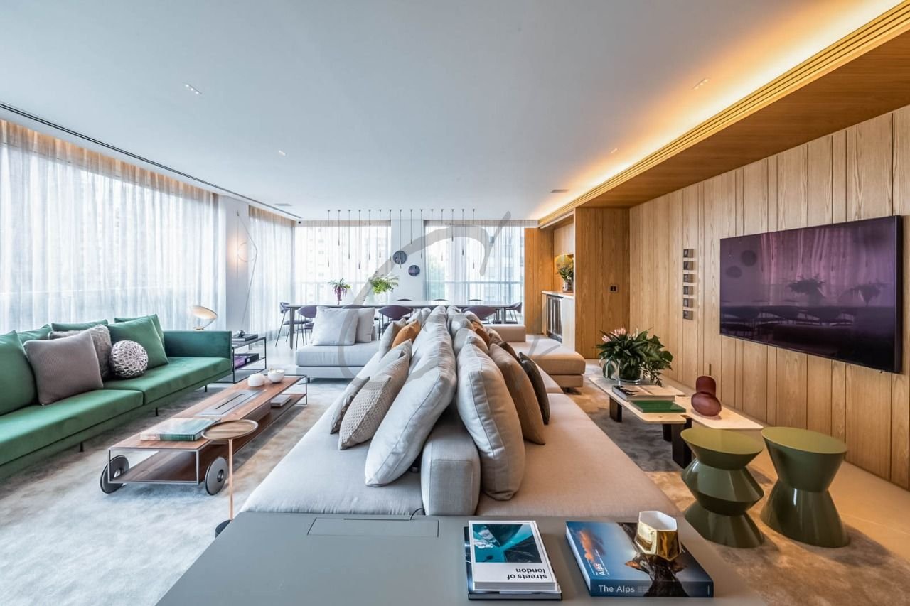 O projeto de marcenaria Florense, juntamente com a automação em todo o apartamento e o sistema de ar-condicionado central, proporcionam um ambiente moderno e funcional.