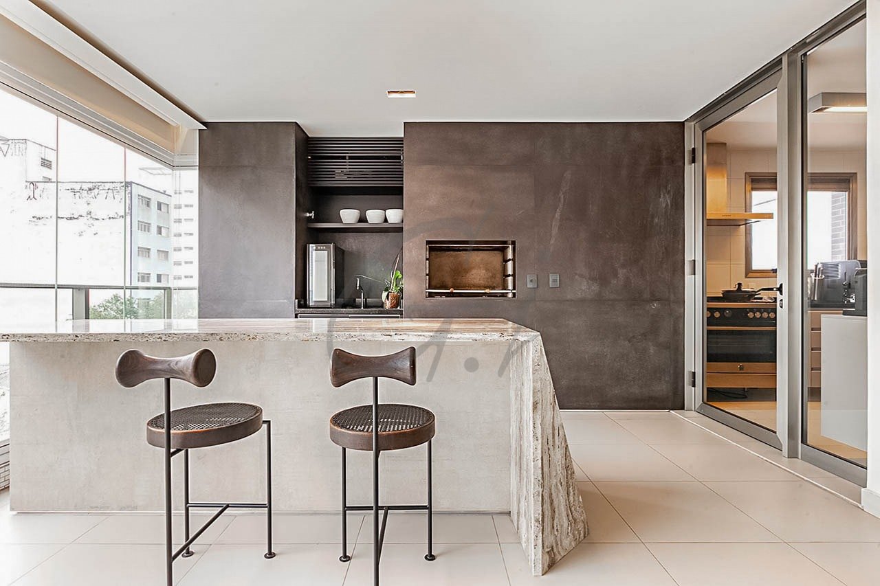Área íntima com 4 suítes, que destaca-se pelo living que se estende até uma varanda em L, funcionando como uma continuidade do ambiente interno.