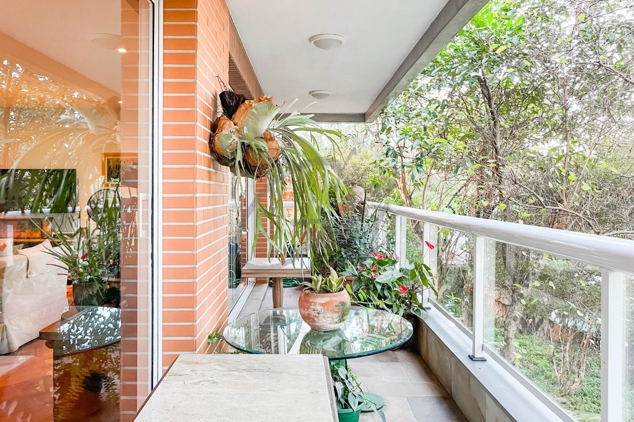 Área social com sala de estar, jantar e varanda com vista para o verde.