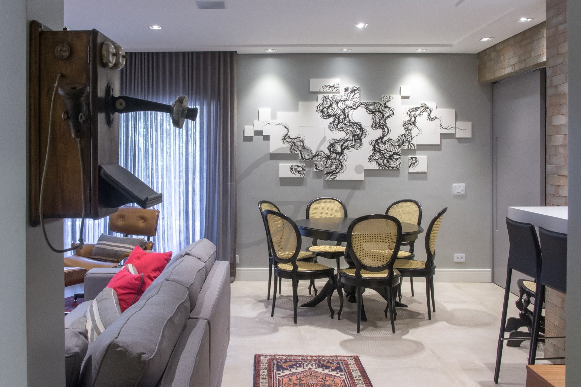 Área social com lavabo combina parede de tijolinhos na integração com a cozinha, folhas de madeira de carvalho na marcenaria e tons cinzas claros, com a varandinha redonda na altura da copa das árvores.