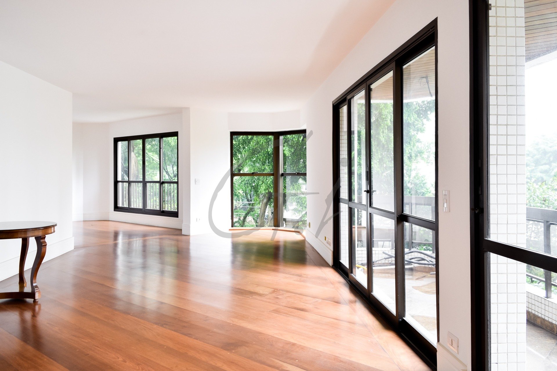 Salas de estar e jantar integradas com piso em tábuas largas de madeira e varanda com vista para o verde. Muitos janelões que permitem a entrada de bastante luz natural.
