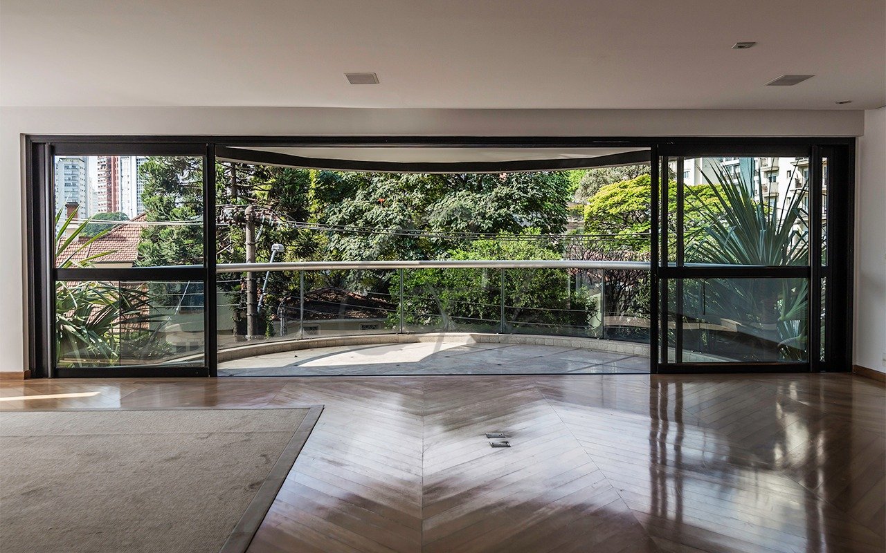 Ampla sala com duas varandas, uma delas com churrasqueira e muito verde.