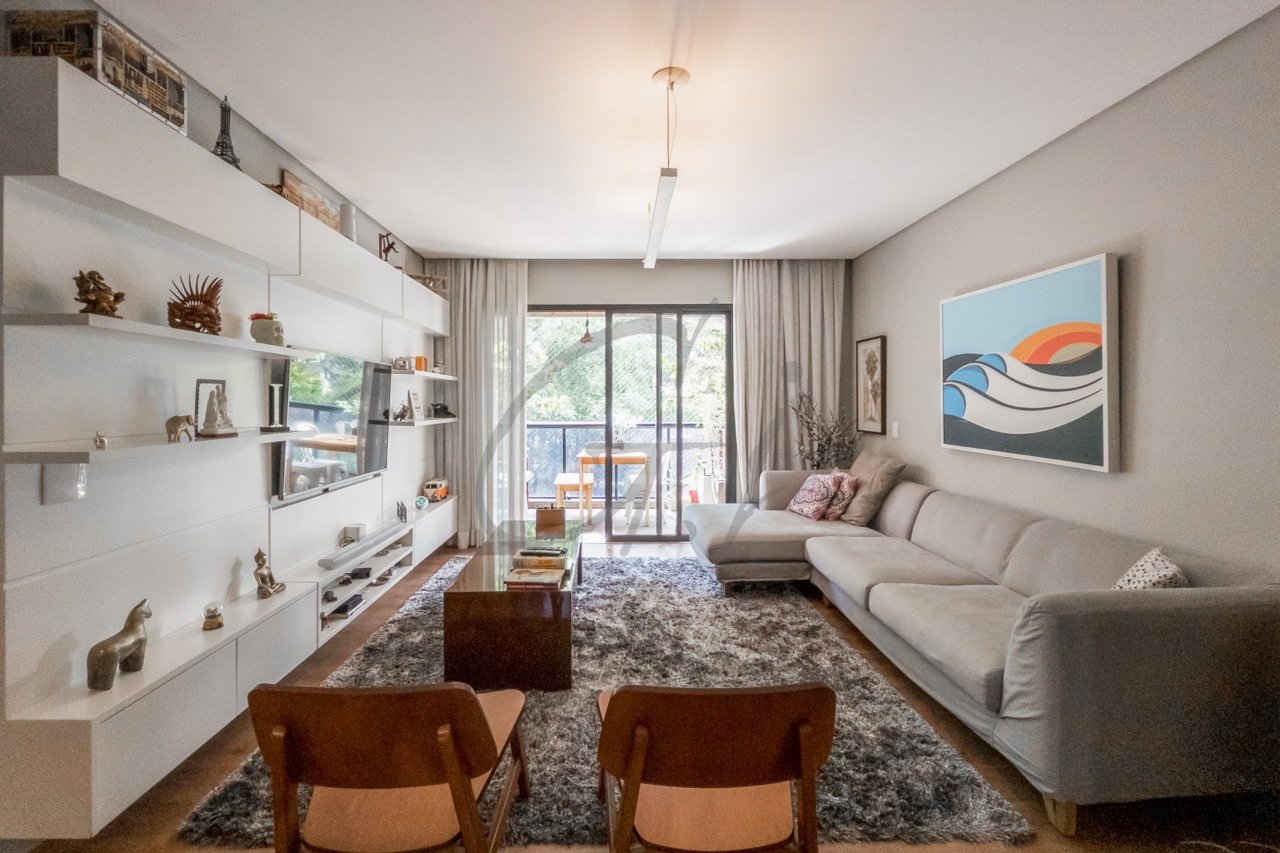 Área social com sala de estar, jantar e varanda com vista para a copa das árvores.