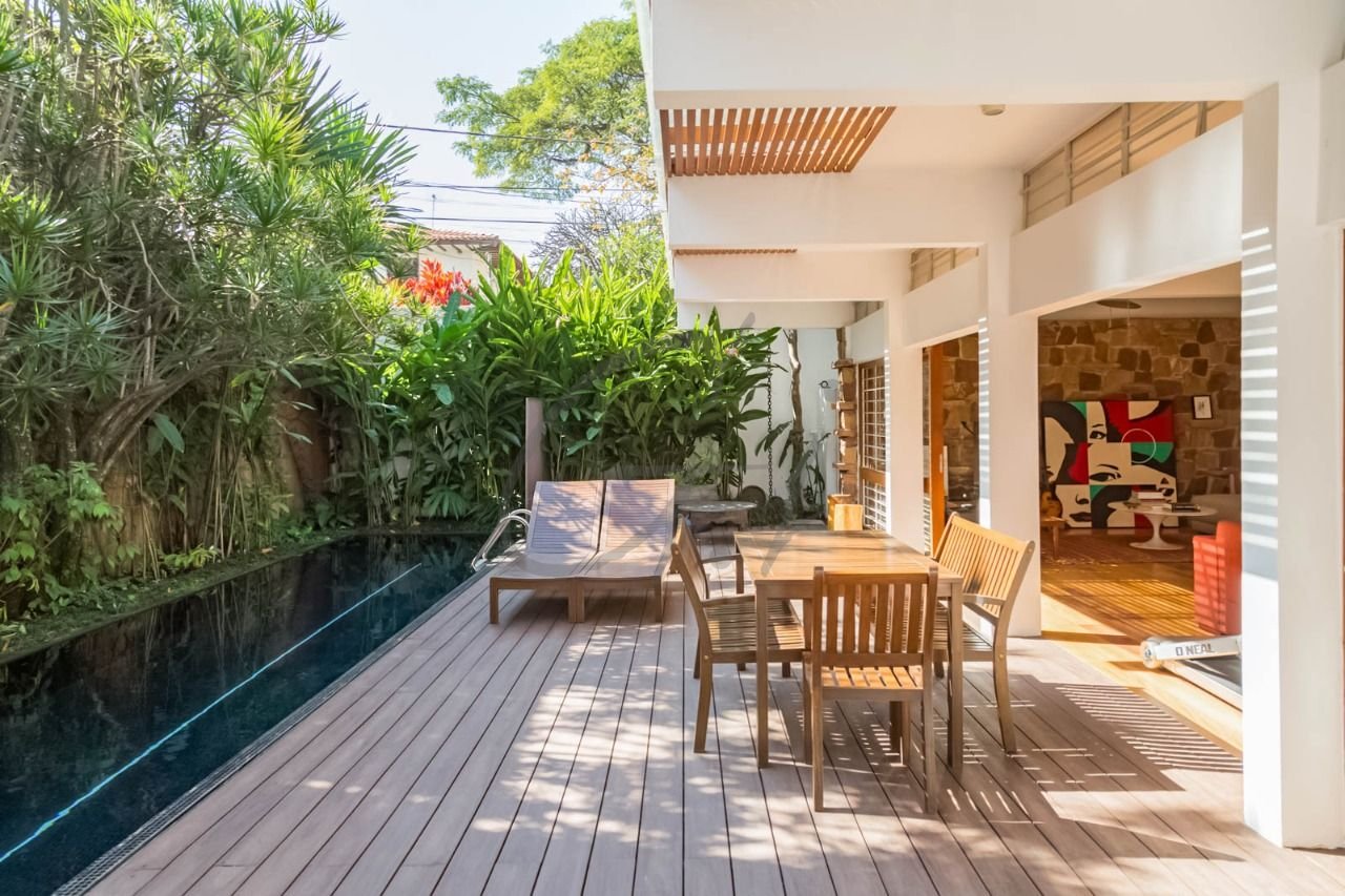 Casa modernista totalmente reformada em rua tranquila e arborizada, com projeto de Paulo Henrique Cardoso, que valorizou os materiais naturais usando piso em peroba rosa, cajarana nas bancadas, pedras naturais e vidro.