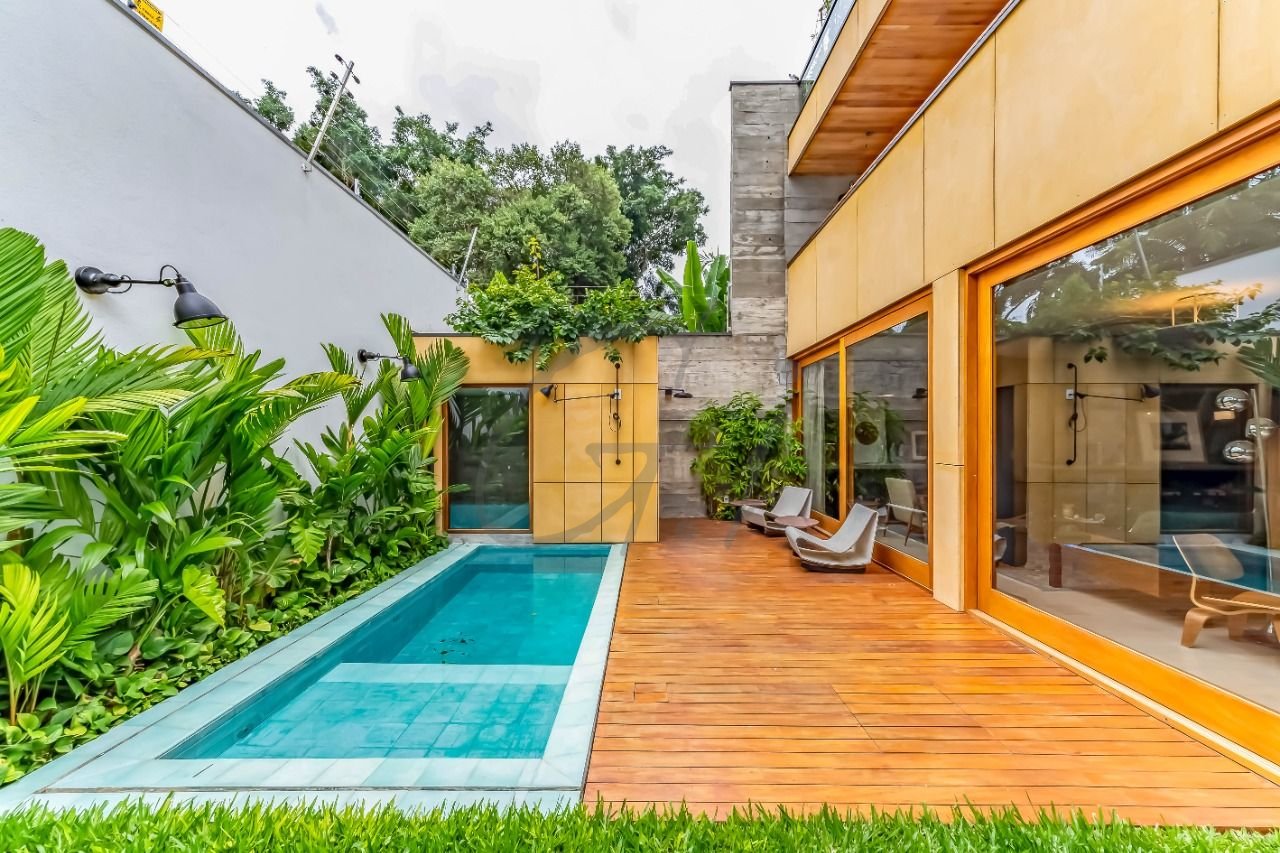 O paisagismo assinado por Ricardo Viana enriquece a área externa, complementada por uma piscina aquecida e sauna.