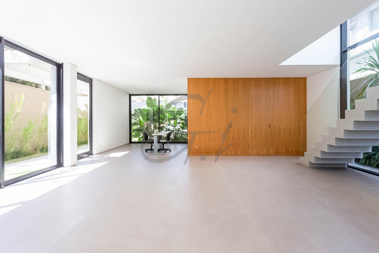 Esquadrias de vidro piso teto que abrem para os jardins e para a piscina.