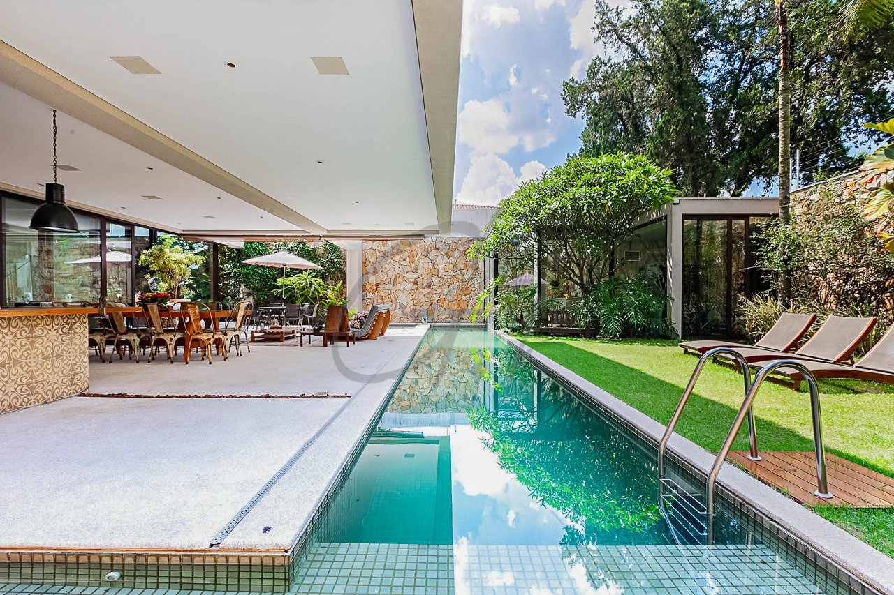 Área externa com jardim, piscina e sauna, além de um requintado espaço com adega.