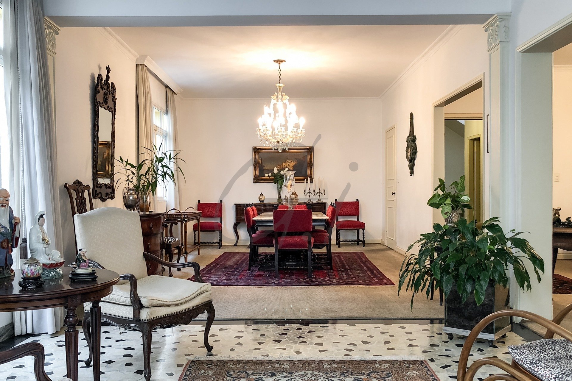 No primeiro pavimento, salas amplas e integradas, com pé direito alto, grandes janelões e ar vintage, cercada pelo jardim.