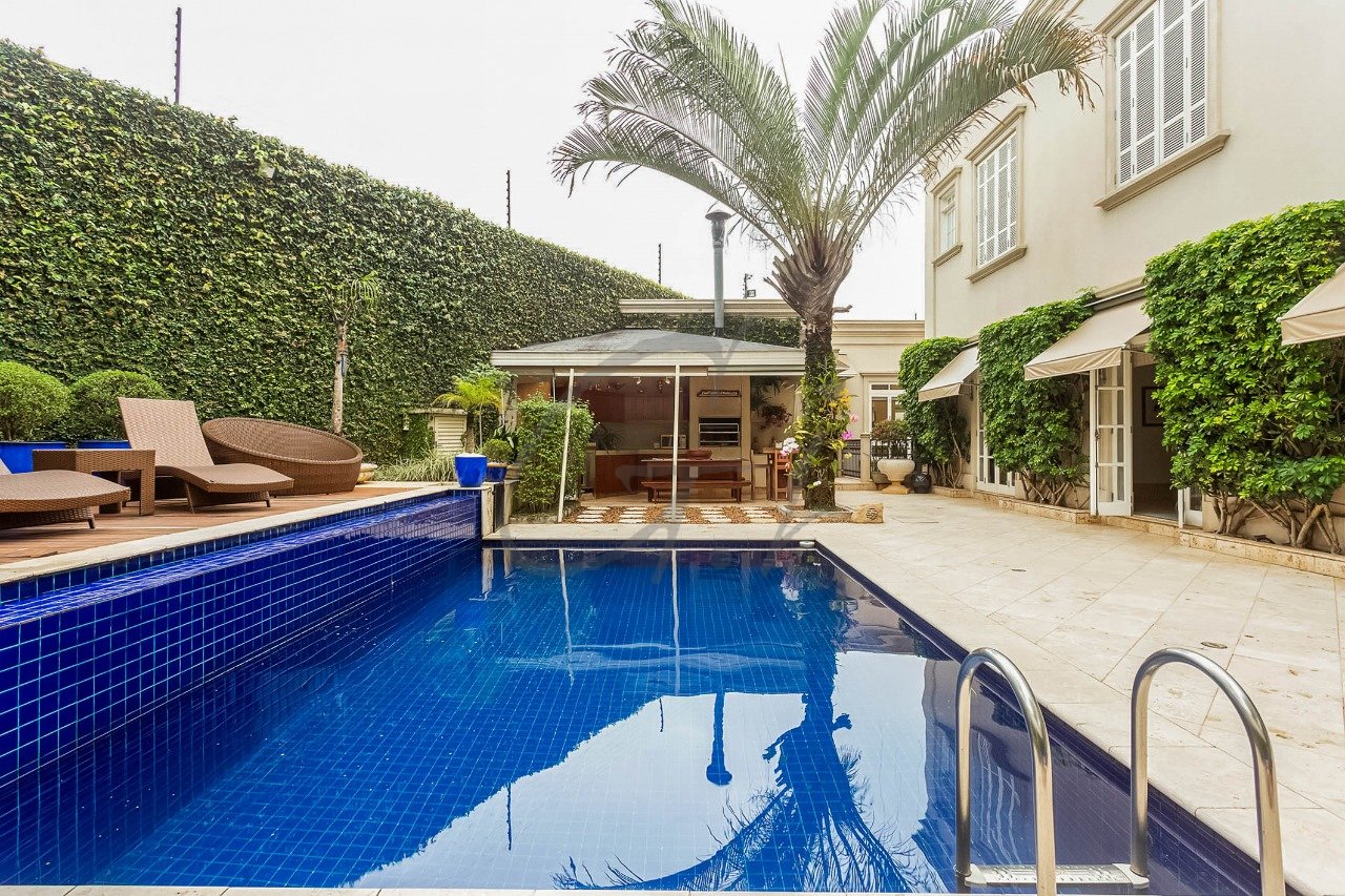 No andar inferior, área social convida ao convívio e entretenimento refinado. A sala de lareira se abre para um jardim bem cuidado.