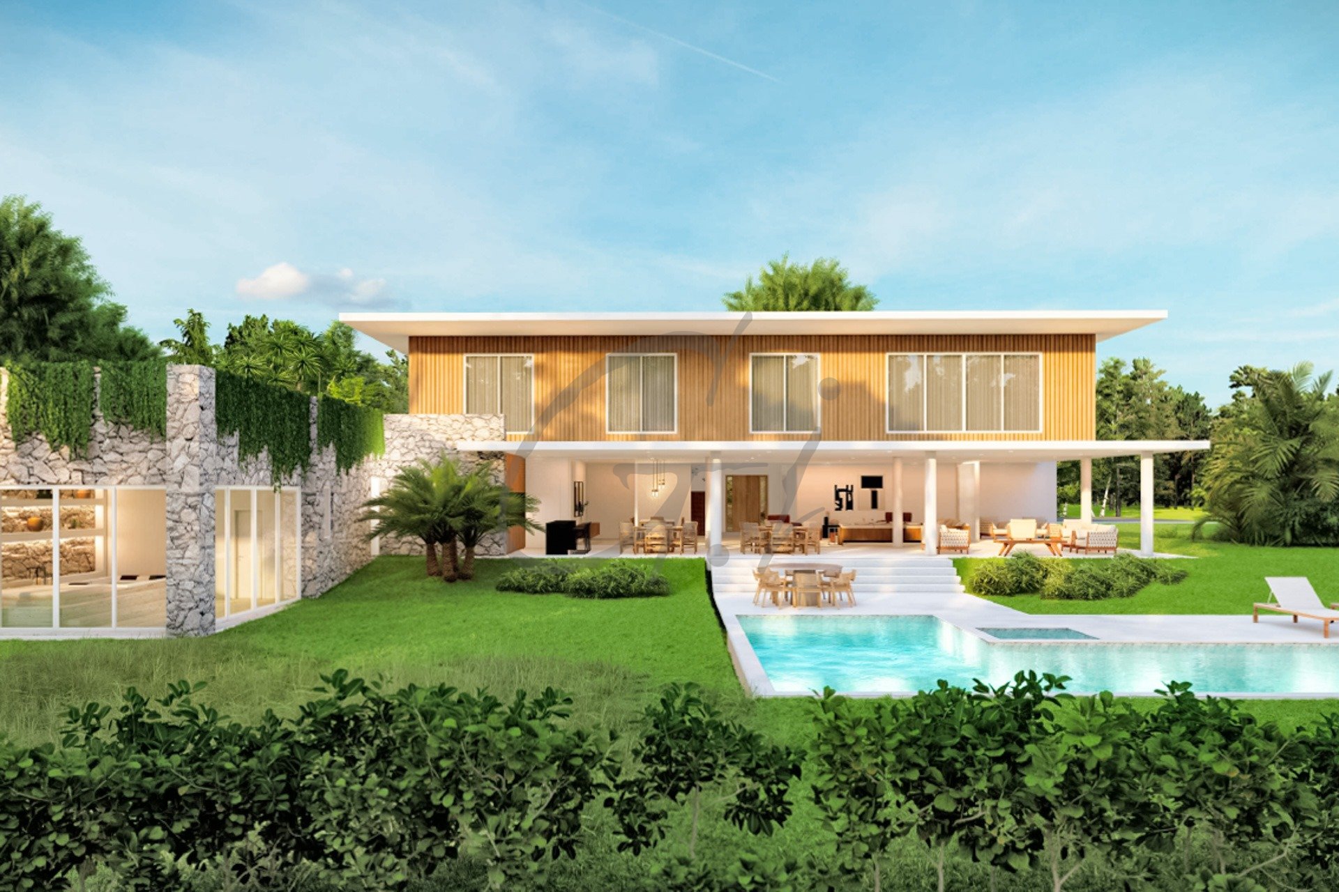Casa espaçosa em construção com linhas retas, vidro, pedra e madeira.