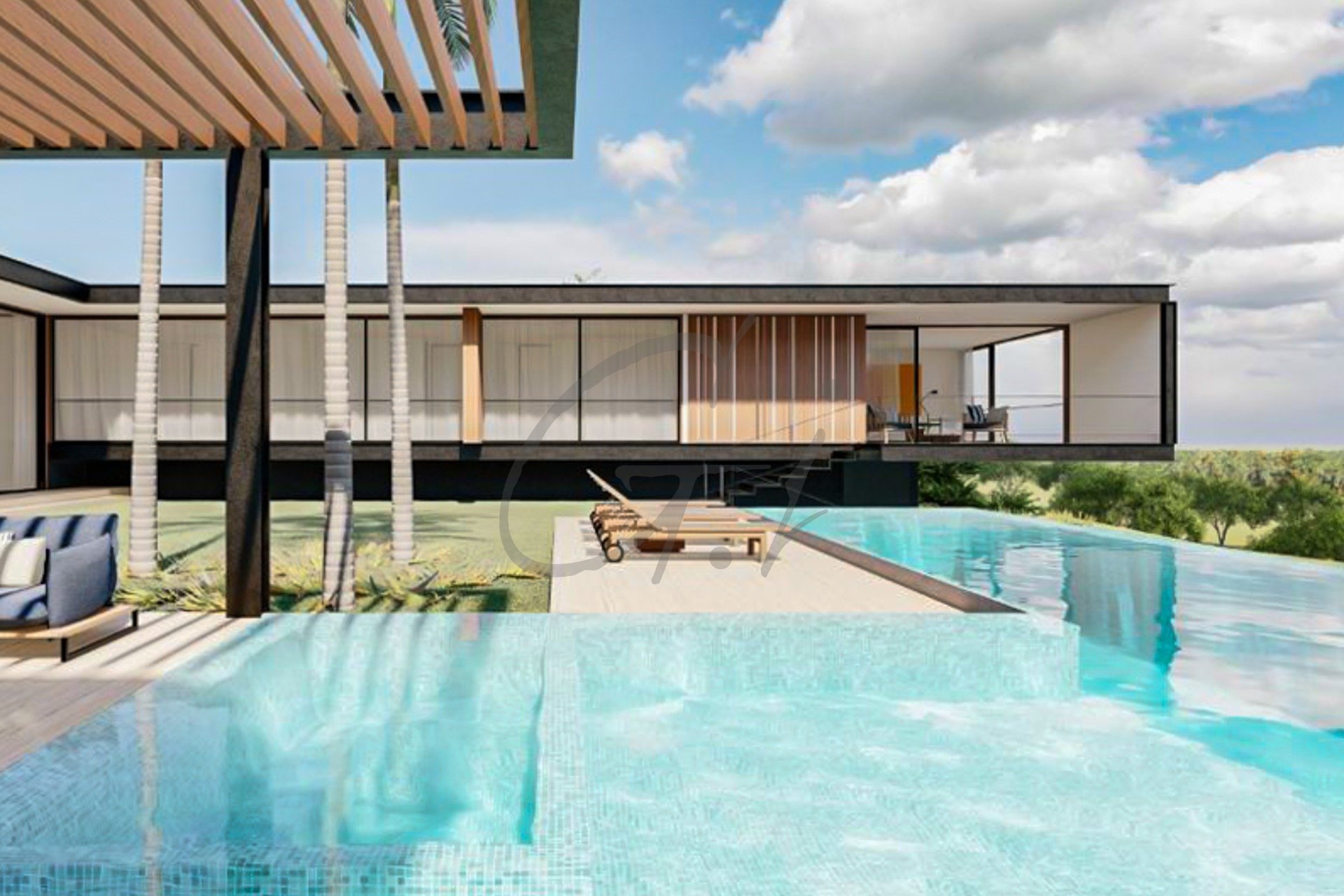Casa térrea projetada por Galvéz & Marton, cercada por verde com jardins internos, linhas retas e vidro. Integração das áreas, trazendo a natureza para dentro da casa.