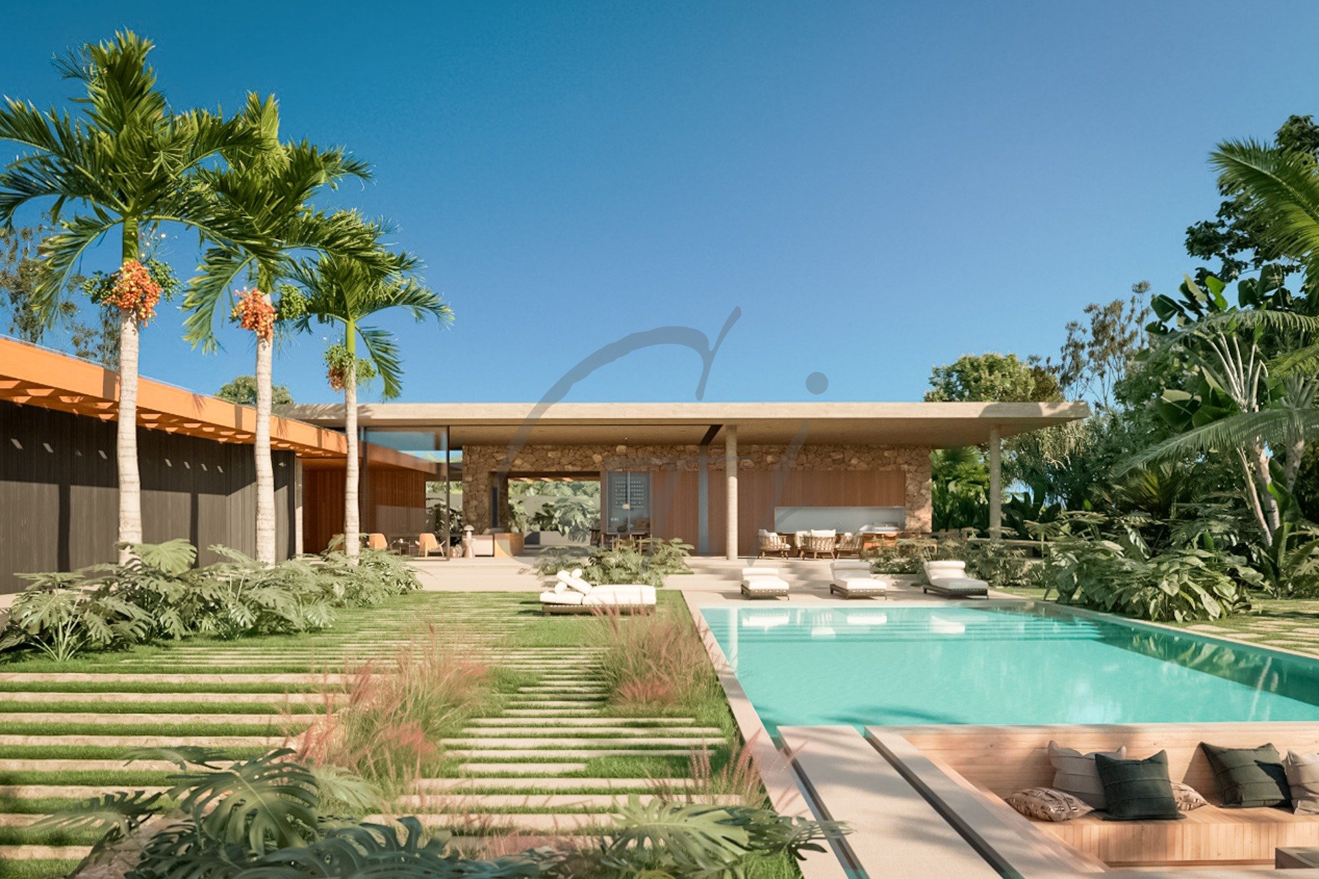Área externa com amplo jardim, paisagismo e piscina de 100m² com fogo de chão.