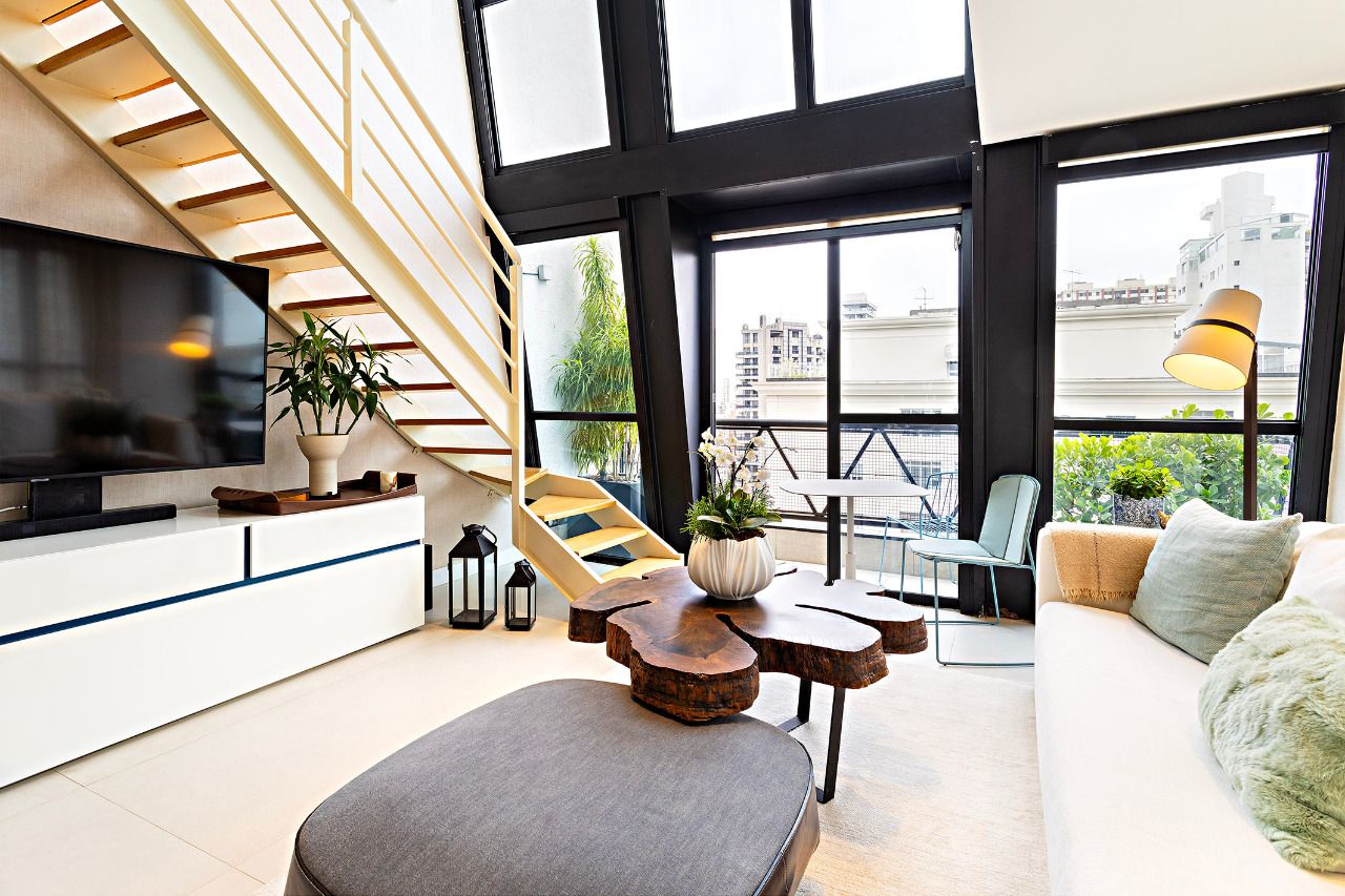 No piso intermediário, um charmoso escritório, com um banheiro, que pode ser facilmente revertido para uma suíte. A janela lateral com vista aberta deliciosa para a rua arborizada.