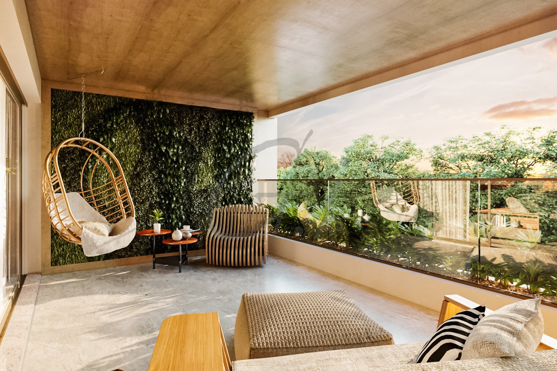 Varanda com acesso à escada que leva ao terraço, com piscina e área gourmet.