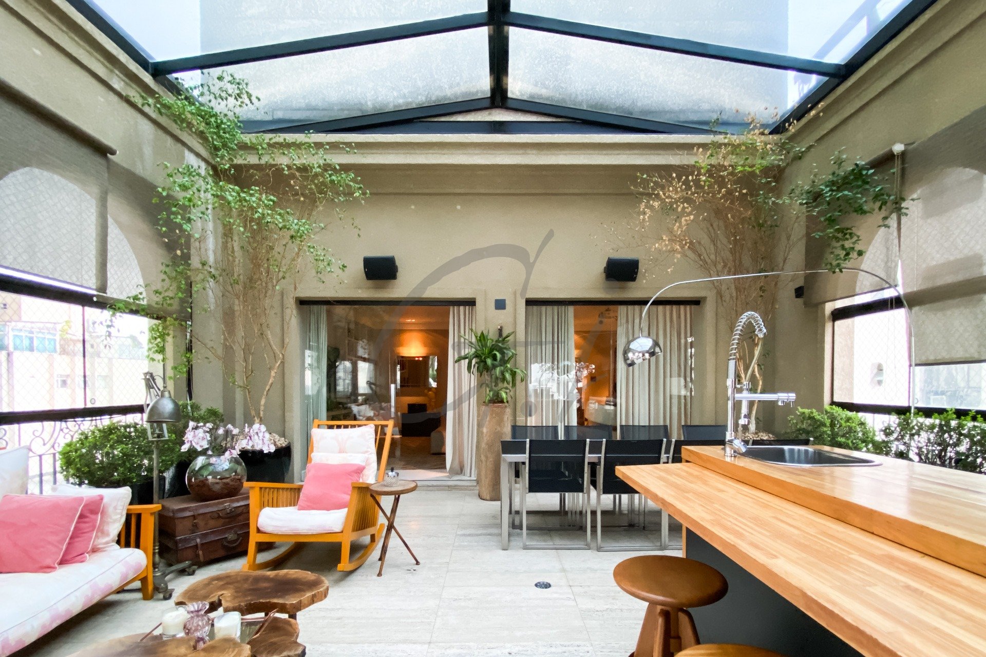 Cobertura duplex com piso em mármore carrara na área social e travertino nas varandas e área externa.