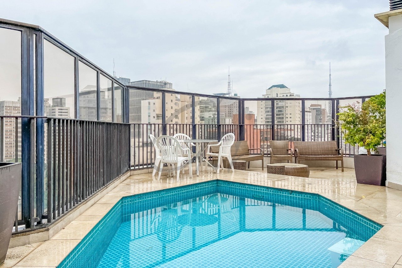 No andar superior, área social com sala de estar e acesso à área externa com piscina.
